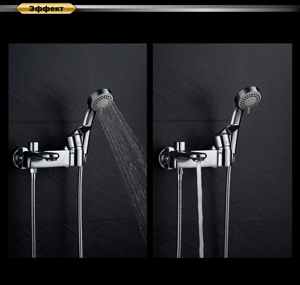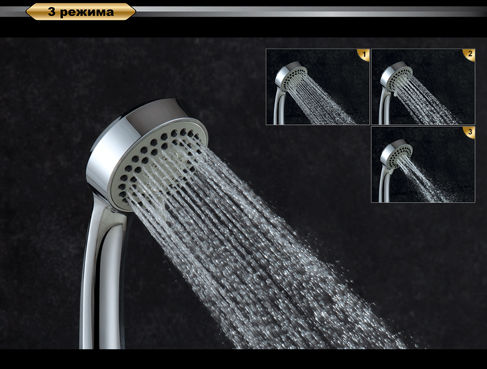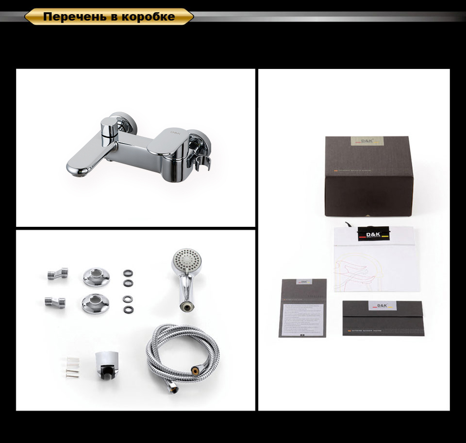 Смеситель, эксцентрики-2шт., декоративная шайба (отражатель)-2шт., шланг душевой, лейка душевая-3 режима, держатель душевой лейки, паспорт, брендовая сумка.