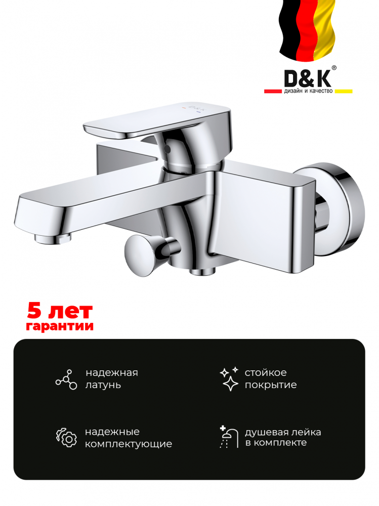 Смеситель, эксцентрики-2шт., декоративная шайба (отражатель)-2шт., шланг душевой, лейка душевая-3 режима, держатель душевой лейки, паспорт, брендовая сумка.