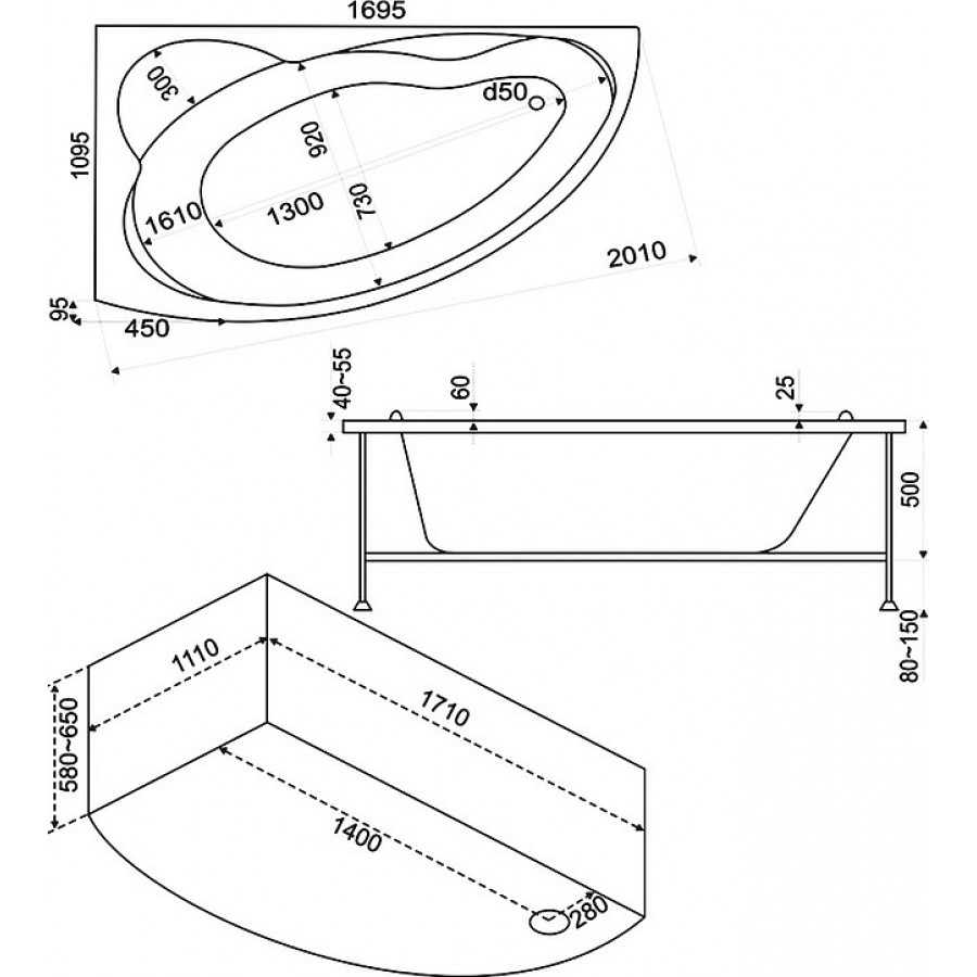 Общие характеристики - Объем воды до верхнего сливного отверстия 295 л - Глубина ванны по центру 440 мм - Высота экрана 550 мм.Комплектация: чаша ванны(каркас, фронтальная панель и слив продаются отдельно)