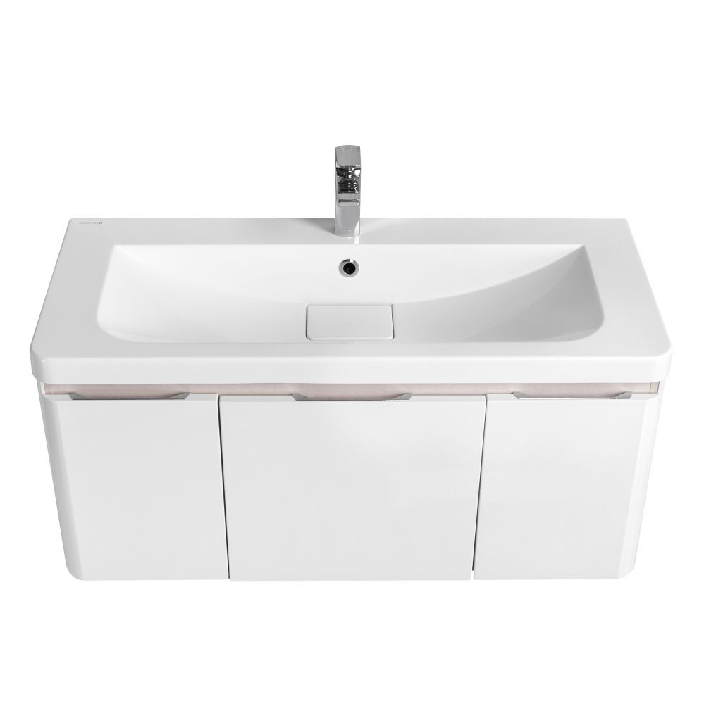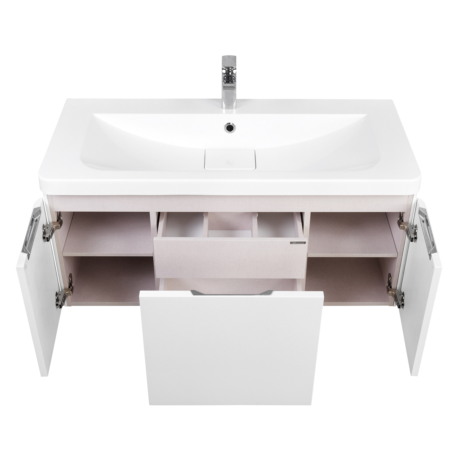 Подвесная тумба под раковину Шерилл 105 от AQUATON отражает современное понимание удобства и комфорта в ванной комнате. Модель сочетает в себе стильный лаконичный дизайн и безупречное исполнение. Корпус из влагостойкой ЛДСП и фасады из МДФ покрыты белой глянцевой краской ультрафиолетового отверждения. Плавные линии, присутствующие в каждом элементе, делают её легкой и воздушной. Скругленные углы и ручки, встроенные в фасады, делают тумбу безопасной, а продуманный функционал и система внутренней организации - удобной. Модель включает двустенный ящик полного выдвижения с системой плавного закрывания, внутренний ящик с системой push-to-open, а за боковыми распашными фасадами находятся дополнительные отсеки с полками. Таким образом, каждая вещь будет на своем месте