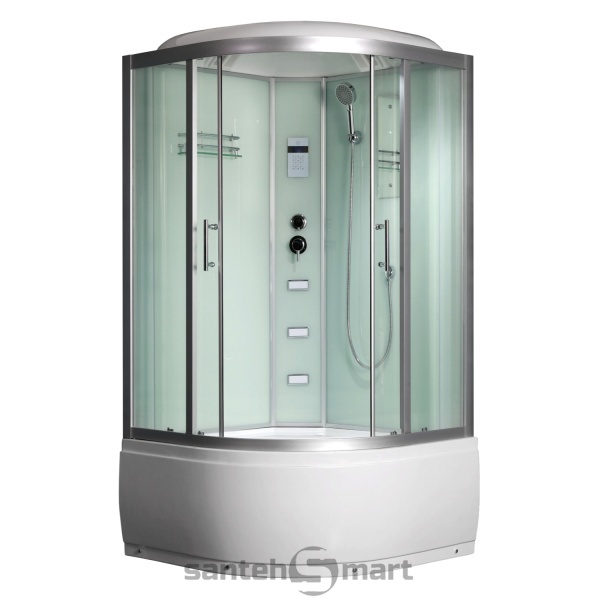 Полностью стеклянная угловая, полукруглая душевая кабина из закалённого (ESG) стекла с высоким подоном. Передние стёкла прозрачные, задние стёкла белые; толщина стёкол 6мм. На центральной стойке размещены сенсорный пульт управления душевой кабиной с дисплеем, 3 направленных форсунки, переключатель режимов, смеситель. Двери в кабине раздвидные, плавность хода которых гарантирована установленными на них двойными металическими роликами, а на торцах дверей установлены алюминиевые магнитные полосы для плотного закрывания душевой кабины. На задних стенках расположены полочка для фитокосметики, зеркало и трёх-позиционная душевая лейка с возможностью интенсивности массажа. В крышу вмонтирован большой верзний душ (тропический) и 2 LED лампы подсветки душевой кабины. Для недопущения переполнения поддона установлен слив-перелив.