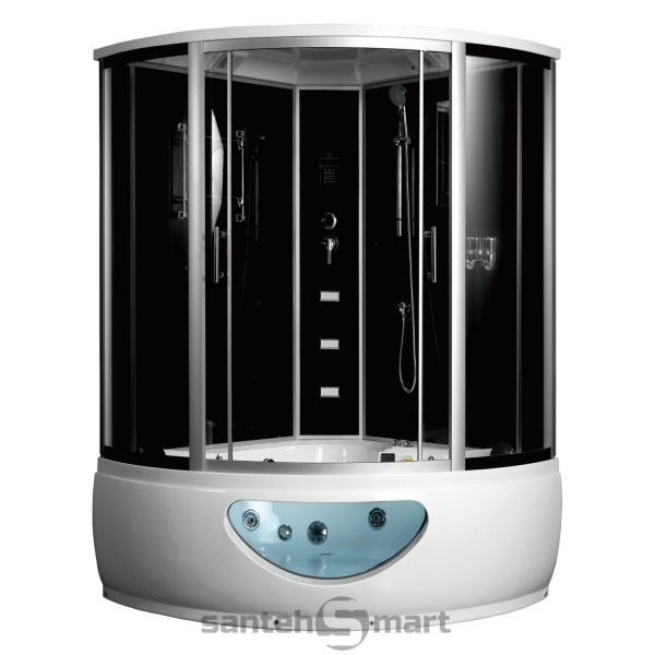 Душевой бокс Frank F651 Black угловой, полукруглый с турецкой баней 50оС и 6-ю гидромассажными форсунками в ванне. Чёрные стеклянные задние стенки с вертикальным гидромассажем.