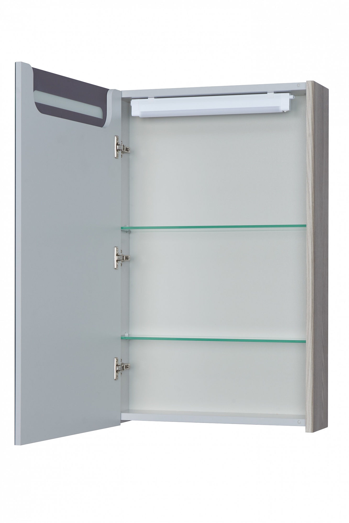 Компактный зеркальный шкаф Сильва 50 от AQUATON в эффектной отделке "дуб фьорд" - оптимальное сочетание практичности, утонченной красоты древесных мотивов и современного дизайна. Фасады с зеркальной отделкой и корпус выполнены из влагостойкой ЛДСП. Шкаф оснащён двумя стеклянными полками и LED-подсветкой. Плавное закрывание дверцы обеспечивают петли с доводчиком. Данная модель прекрасно впишется в скандинавский стиль, минималистичный лофт или хай-тек