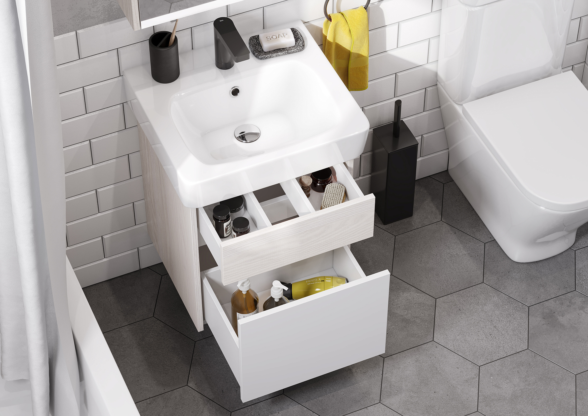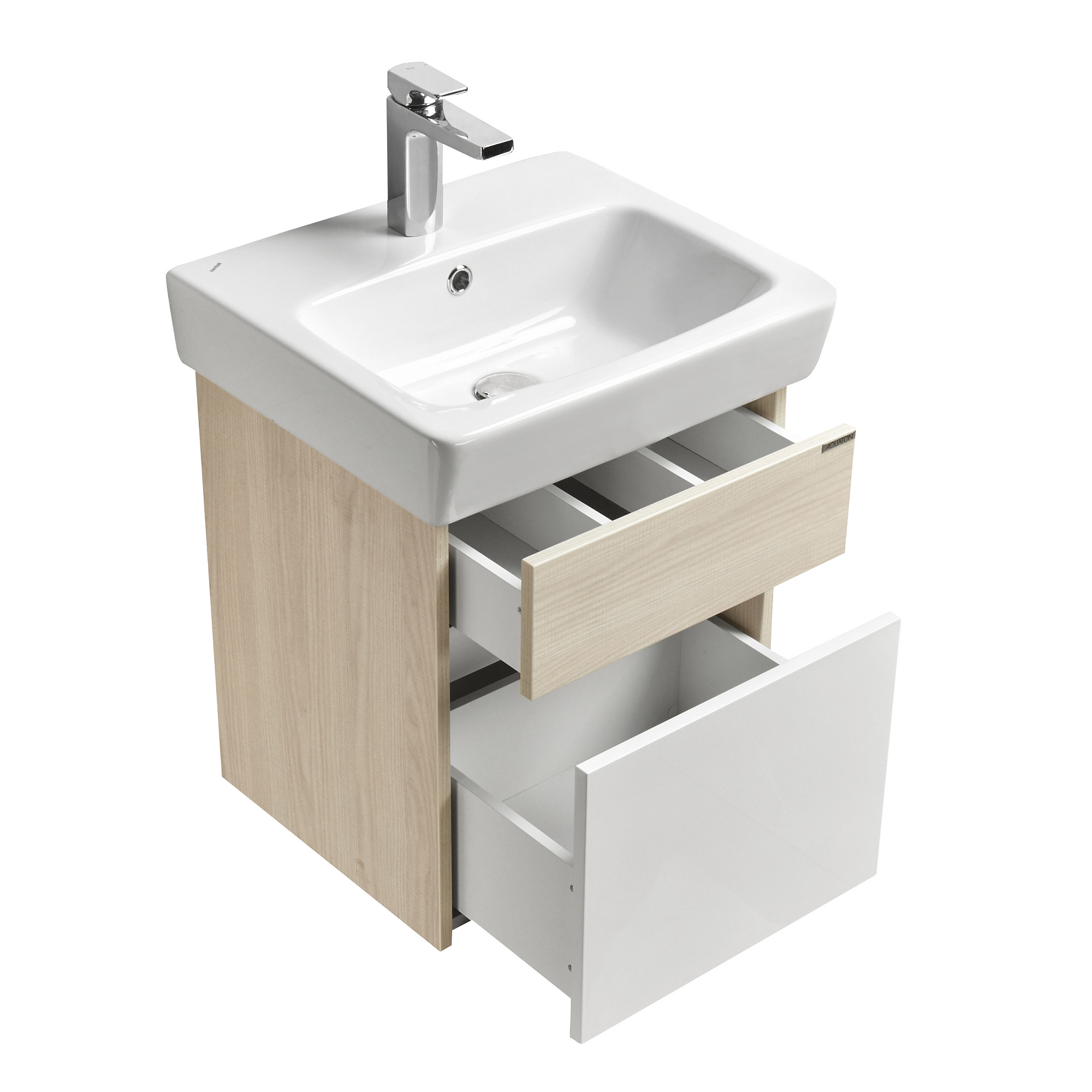 Подвесная тумба под раковину Верди PRO 50 от AQUATON - функциональное и практичное решение для ванных комнат и санузлов со скромными габаритами. Компактная модель с комбинированной отделкой не занимает много места и позволяет разместить всё необходимое. Минималистичный дизайн подчеркивает отсутствие лицевой фурнитуры. Верхний фасад и корпус тумбы изготовлены из ламинированной, текстурированной влагостойкой ЛДСП в цвете ясень фабрик. Нижний фасад выполнен из МДФ и окрашен в белый цвет высокой степени глянца. Конструкция верхнего ящика подвесных тумб разделена на две секции, что очень удобно для хранения мелких предметов. Глубокий и вместительный нижний ящик предназначен для более габаритных предметов