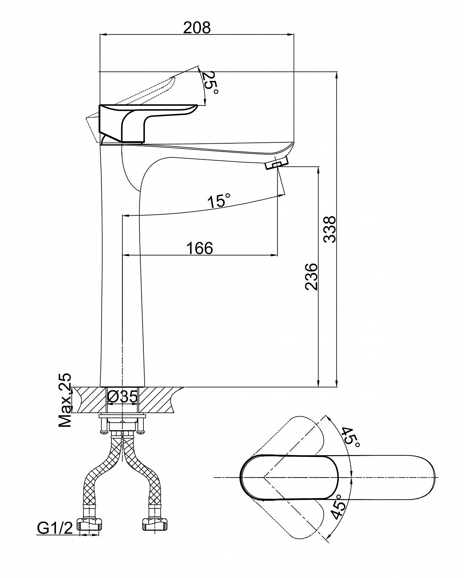 Пластиковый аэратор установлен под углом для комфортной эксплуатации, уменьшает расход воды.