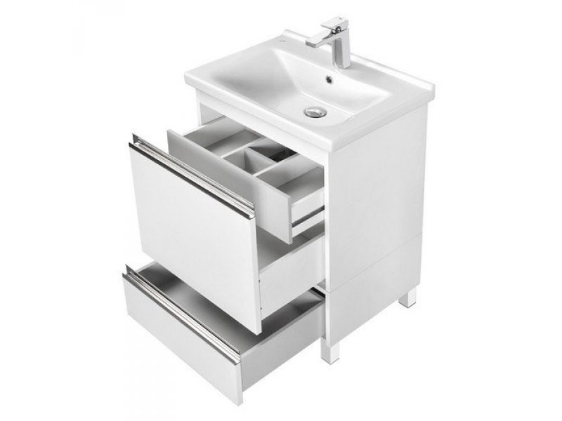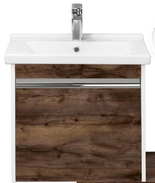 Стильная тумба под раковину Капри 60 от AQUATON отражает современные тенденции в дизайне мебели для ванных комнат: минимализм в чистом виде с простыми и понятными формами, отсутствие лишних деталей, удобные профильные ручки, интегрированные в фасад. Корпус выполнен из влагостойкой ЛДСП и покрыт белой глянцевой краской, фасады также изготовлены из влагостойкой ЛДСП в эффектной декоративной отделке тёмная таксония. Несмотря на компактные размеры, тумба предлагает удобную систему хранения, что особенно актуально для небольших ванных комнат и санузлов. Модель оборудована двумя вместительными ящиками. Комфорт и удобство при использовании гарантируют направляющие с доводчиками и интегрированная система плавного закрывания. В качестве дополнения к подвесной тумбе предлагается дополнительный комод на ножках, который может быть установлен как непосредственно под тумбой, так и со смещением влево или вправо