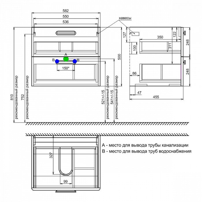 2 внешних ящика. В верхнем ящике расположен ограничитель под сифон, в нижнем ящике - перекатной организатор