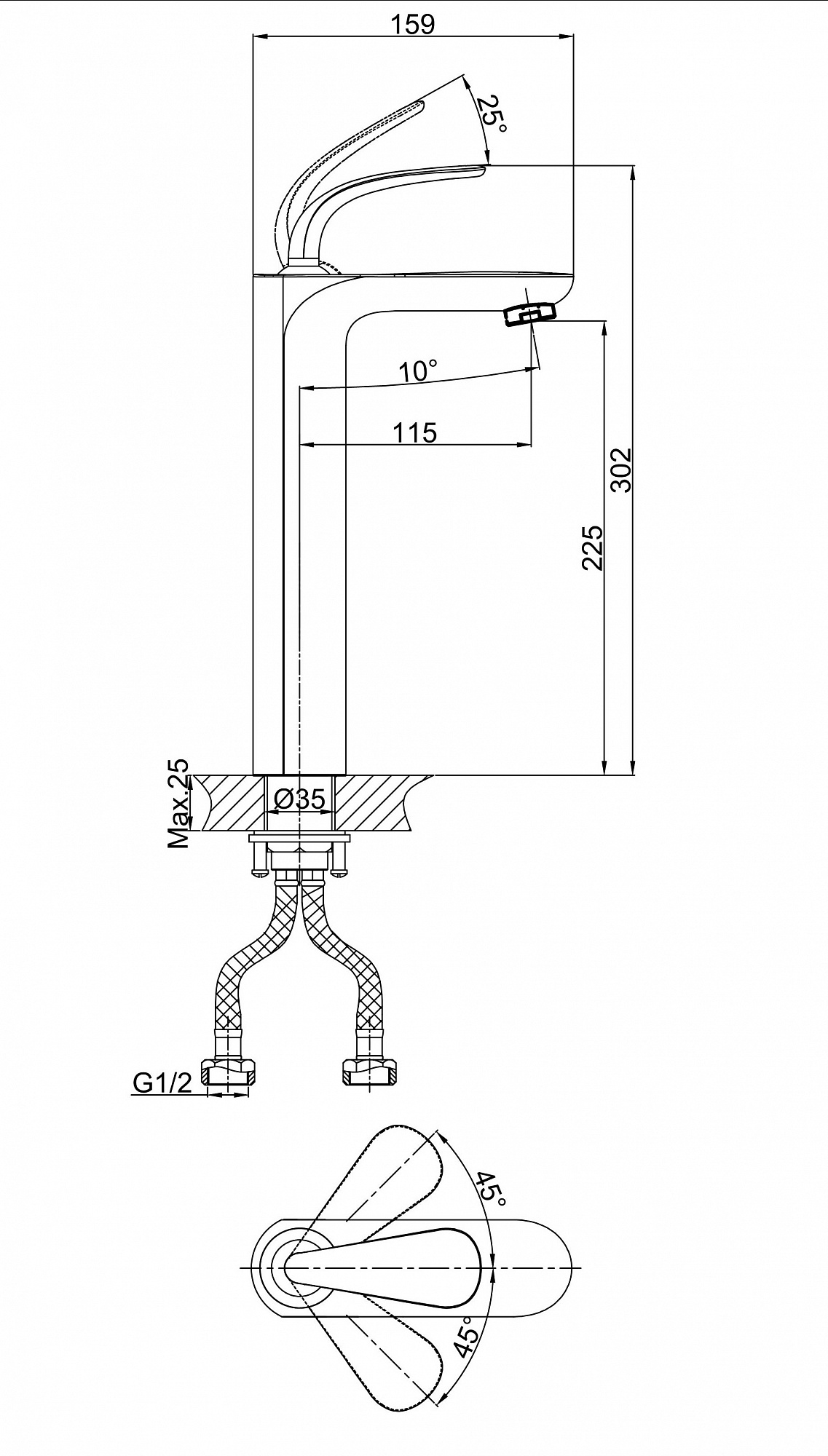 Высота смесителя: 302 мм.