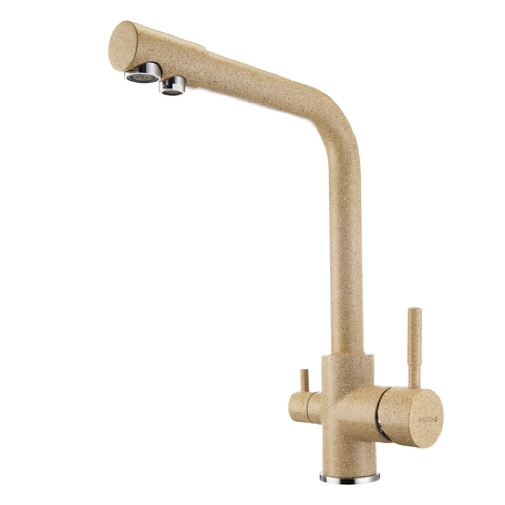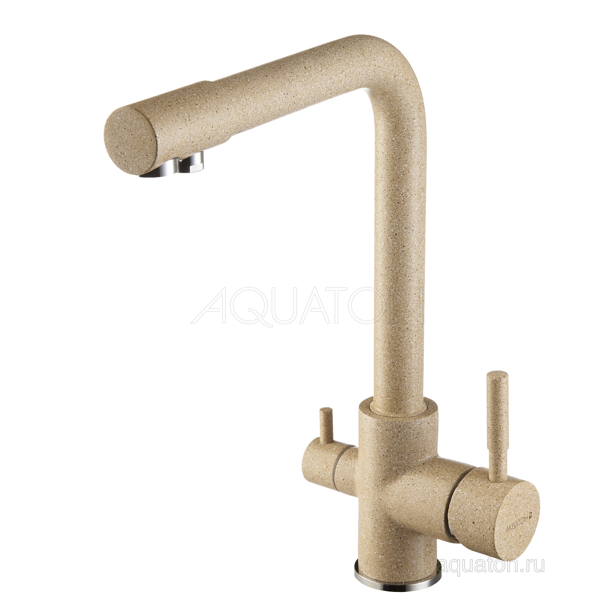 Подключение к фильтру питьевой воды. Совмещенный излив. Цвет смесителя специально подобран в соответствии с цветом кухонных моек Акватон из литьевого камня. Корпус смесителя выполнен из латуни, что гарантирует долгий срок эксплуатации изделия, сопротивление коррозии и безопасность для человека. Декоративное цветное покрытие отличается высокой силой сцепления с поверхностью смесителя, обеспечивая устойчивость к царапинам и сколам