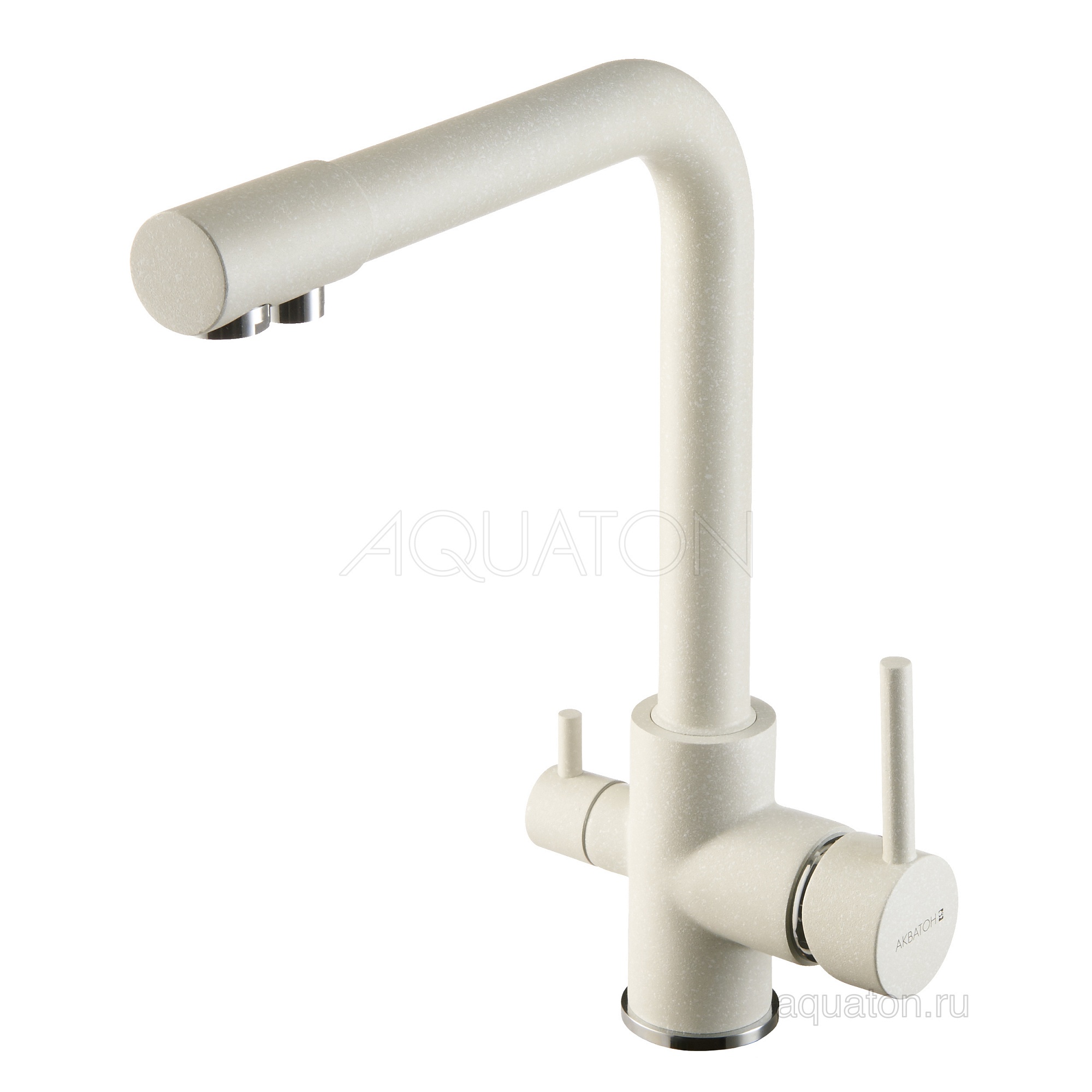 Подключение к фильтру питьевой воды. Совмещенный излив. Цвет смесителя специально подобран в соответствии с цветом кухонных моек Акватон из литьевого камня. Корпус смесителя выполнен из латуни, что гарантирует долгий срок эксплуатации изделия, сопротивление коррозии и безопасность для человека. Декоративное цветное покрытие отличается высокой силой сцепления с поверхностью смесителя, обеспечивая устойчивость к царапинам и сколам