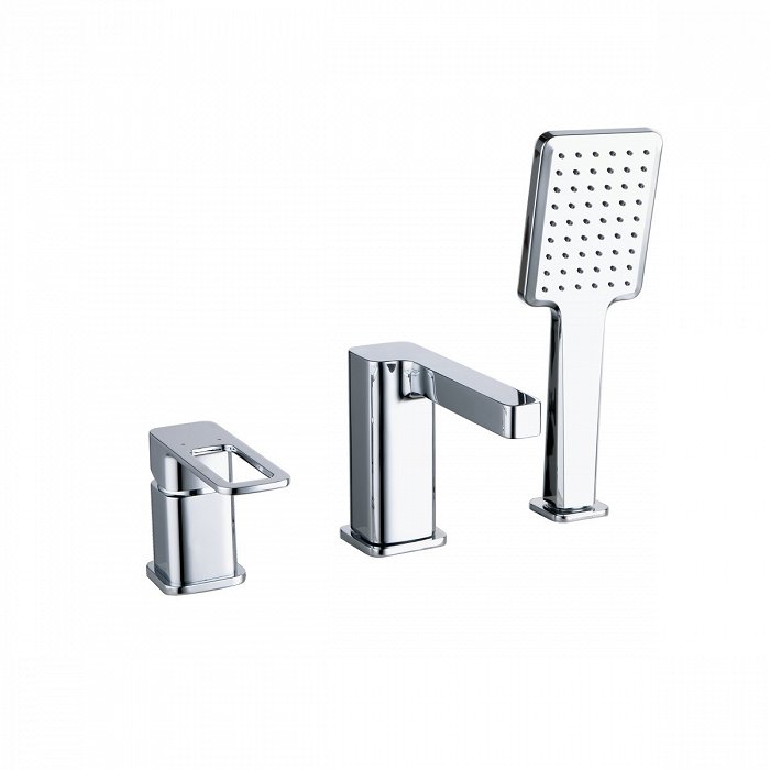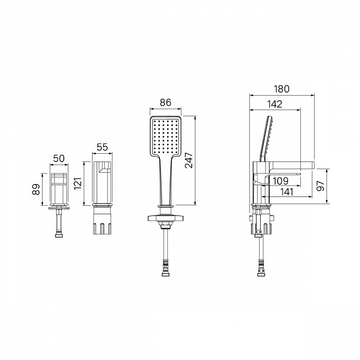 Блок регулировки, блок дивертора, комплект крепления, ручная лейка, блок держателя лейки, пластиковая проставка, груз для шланга, душевой шланг (2 м), гибкая подводка, соединительный шланг