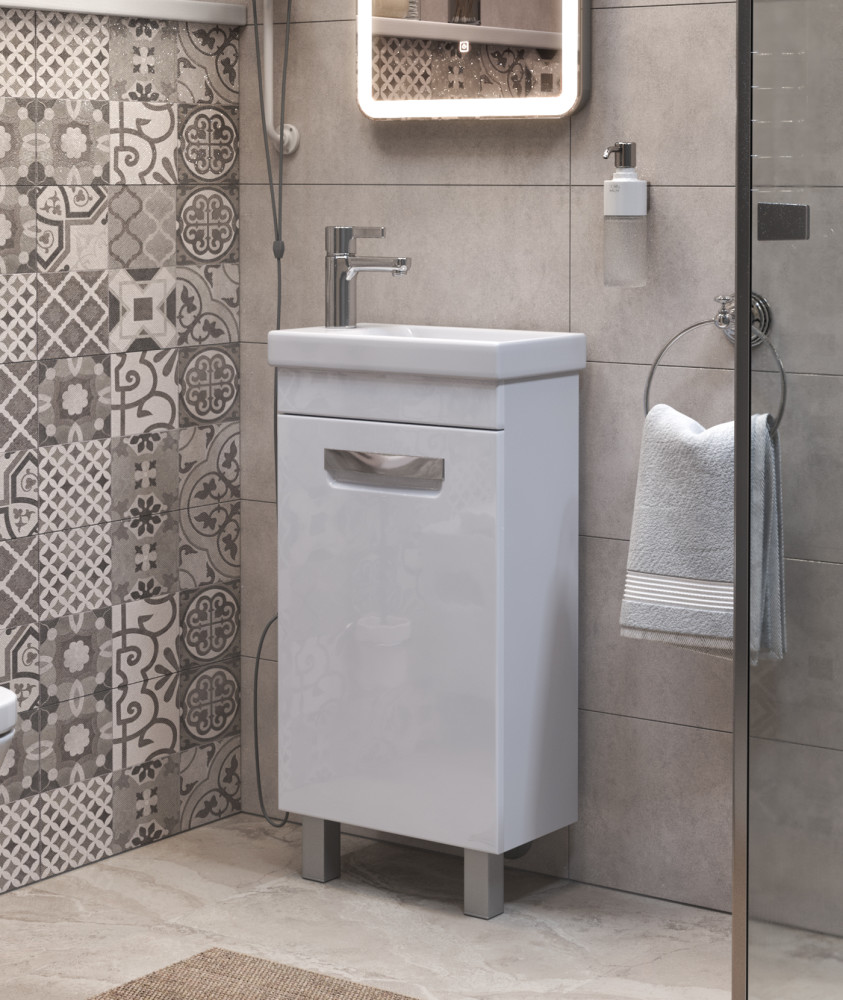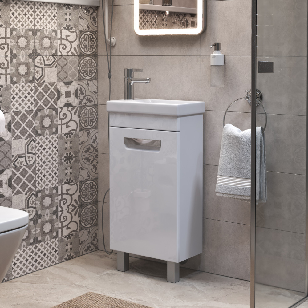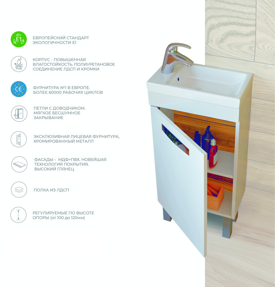1 дверца; 1 полка ЛДСП; ручка врезная металлическая хромированная, опоры квадратные регулируемые.