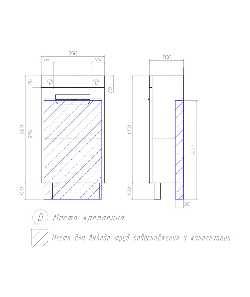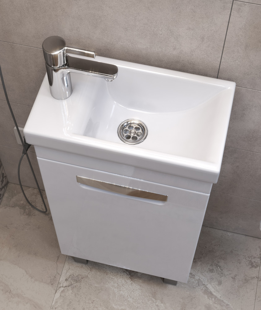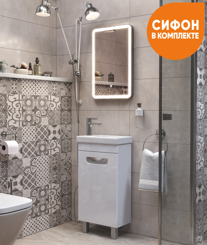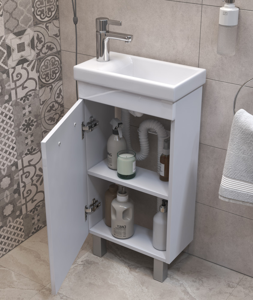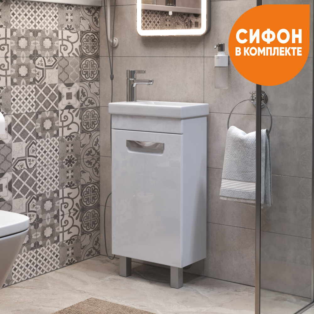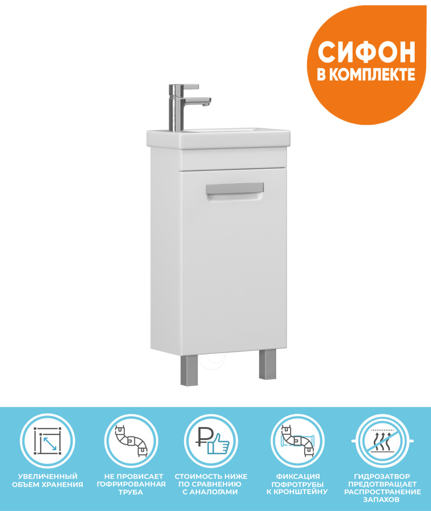 1 дверца; 1 полка ЛДСП; петли с механизмом доводчика, ручка врезная металлическая хромированная, 2 опоры квадратные регулируемые, 1 сифон