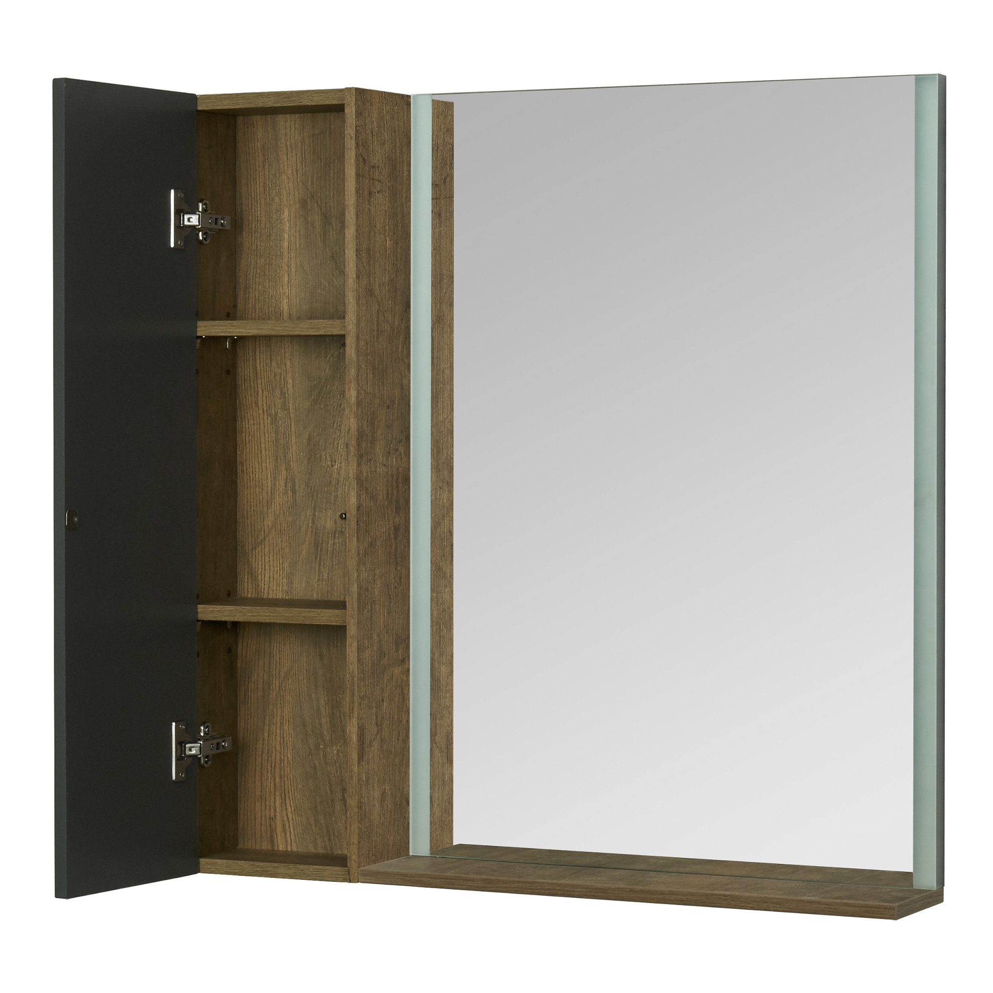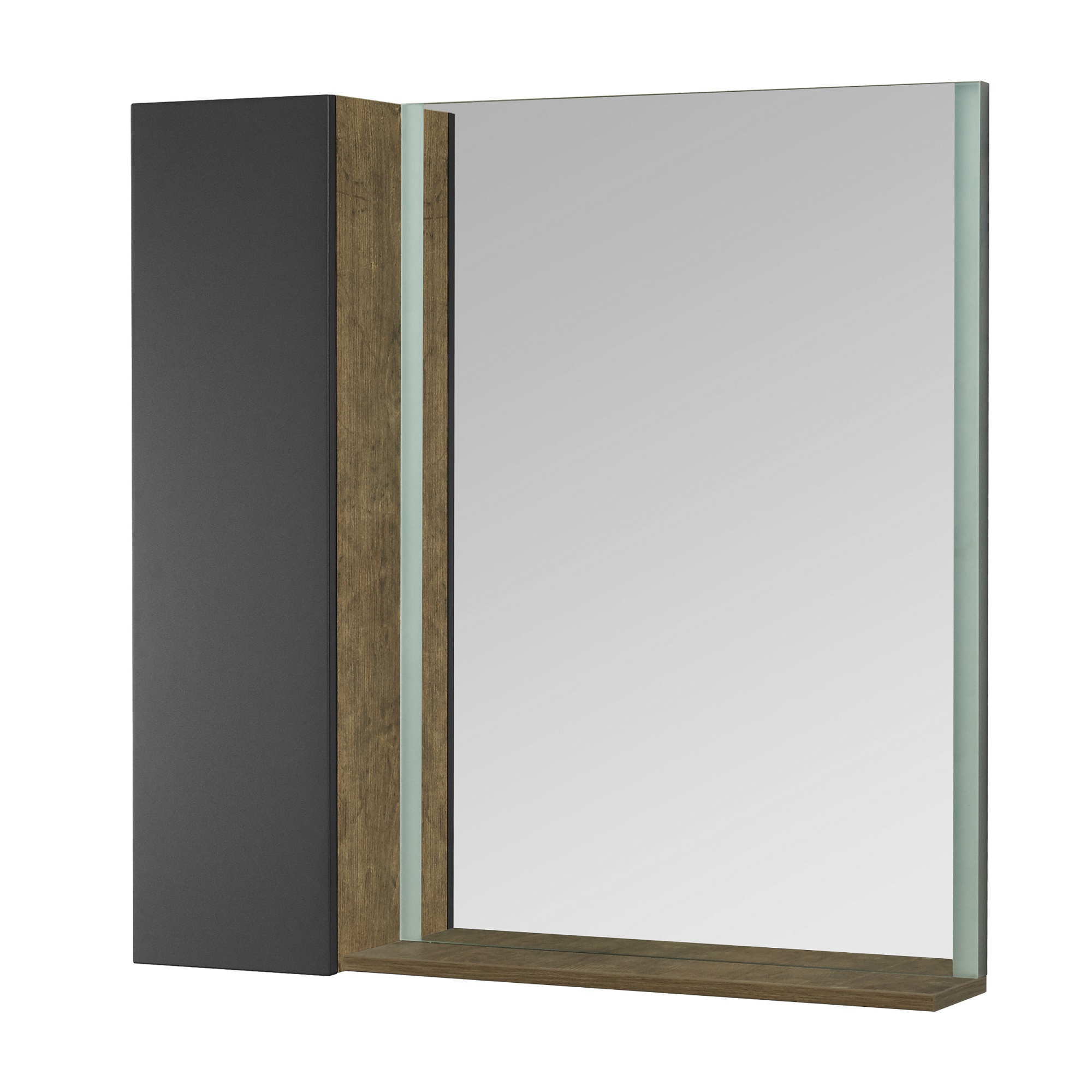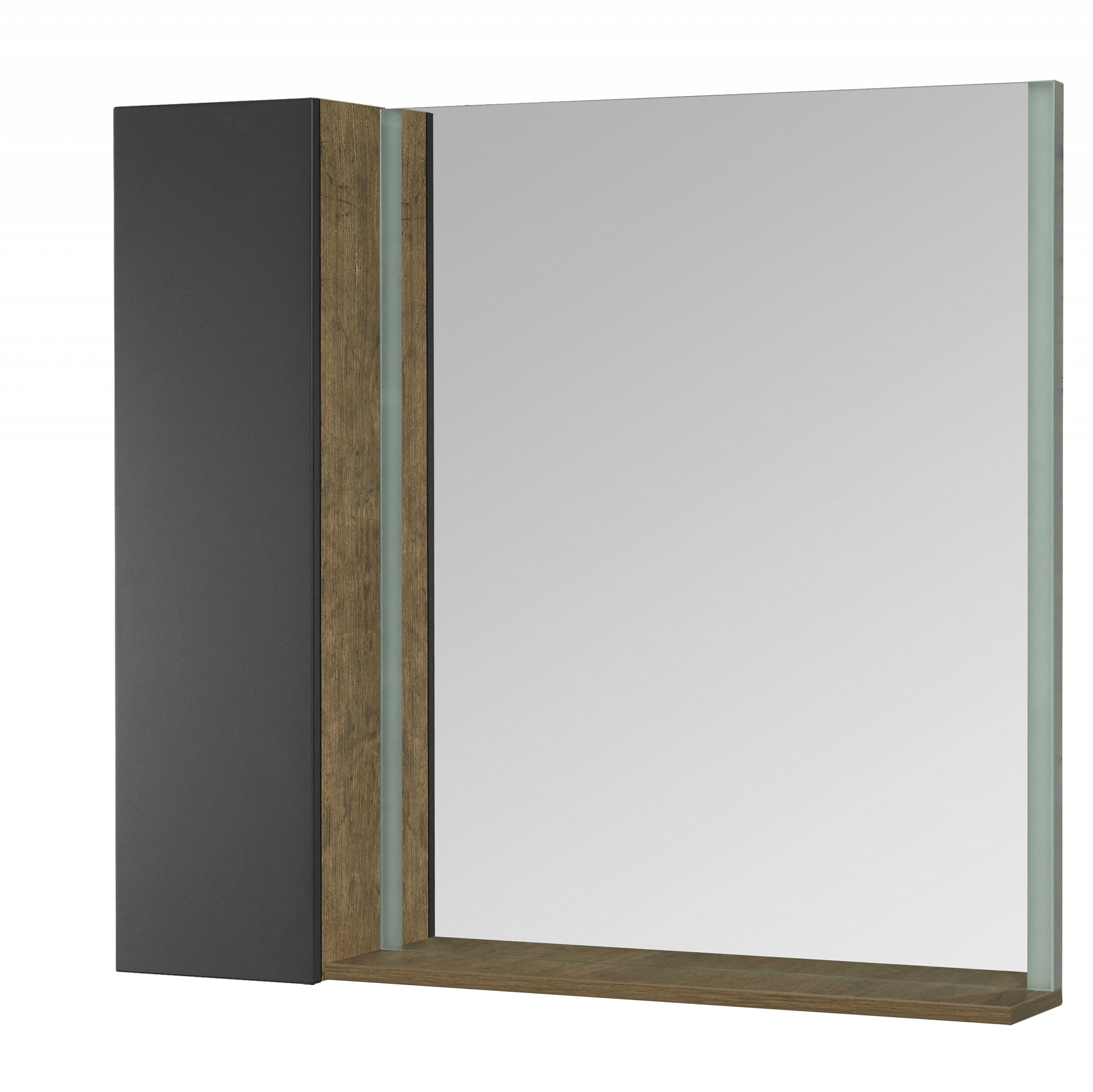 Зеркало для тумбы Терра 105 комплектуется из зеркала 70 с встроенными LED-светильниками по боковым сторонам и дополнительного функционального модуля 35с открытыми полками для косметических и декоративных средств, а за фасадом расположены регулируемые полки. Внутреннее пространство модуля выполнено в декоре дуб кантри