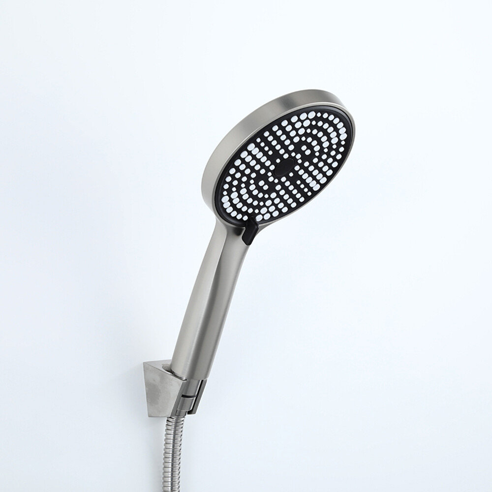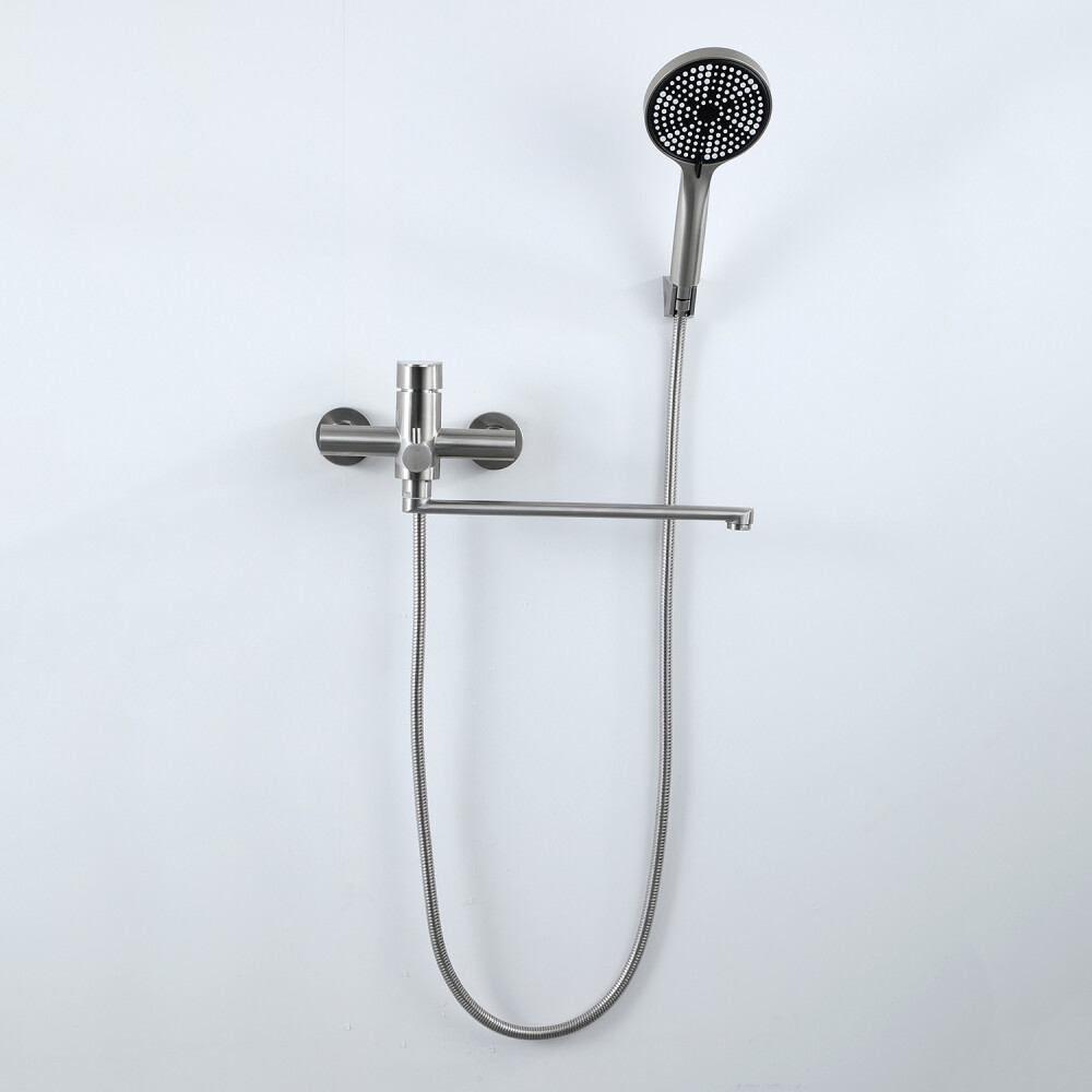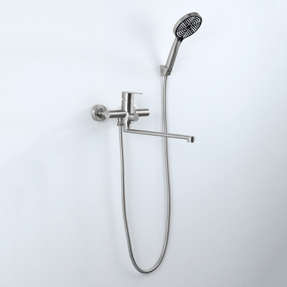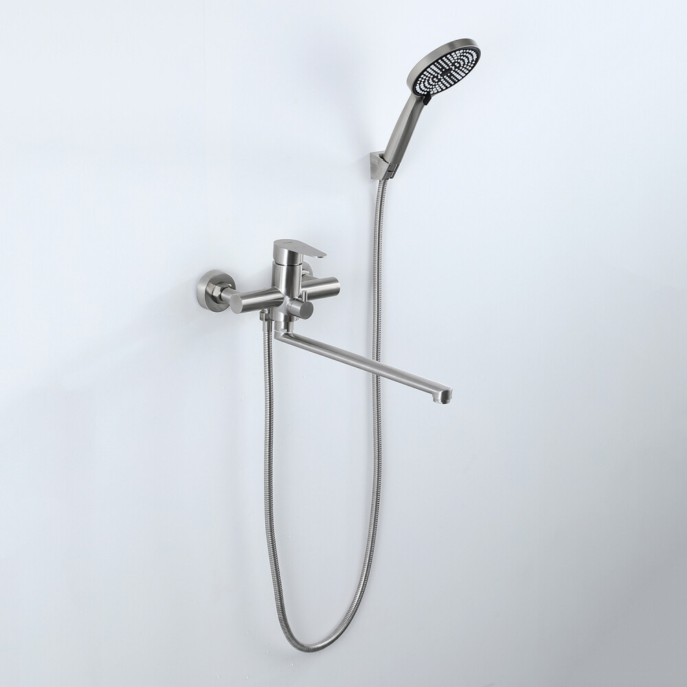 Модель оснащена переключателем-дивертором, работающим плавно и без заеданий. В комплект входит полный душевой набор: левая, металлический шланг 150 см с защитой от перекручивания и настенный держатель. Анти-известковая система облегчает уход, предотвращая образование налёта на лейке.