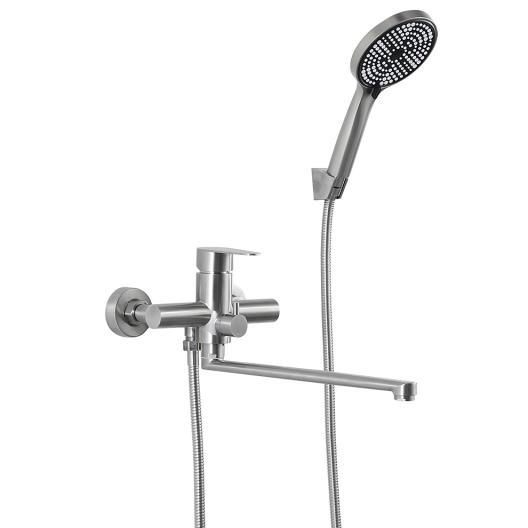 Удобное рычажное управление обеспечивает плавную регулировку напора и температуры воды, а надёжный керамический картридж гарантирует долговечность работы. Длинный поворотный излив 35 см позволяет комфортно использовать смеситель как для наполнения ванны, так и в режиме раковины — идеальное решение для совмещённых санузлов.