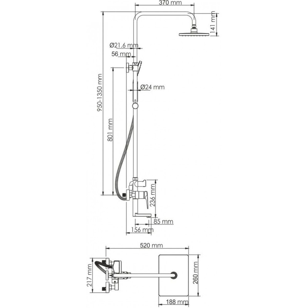 Стойка для душа, Ø 24 мм регулируемая по высоте