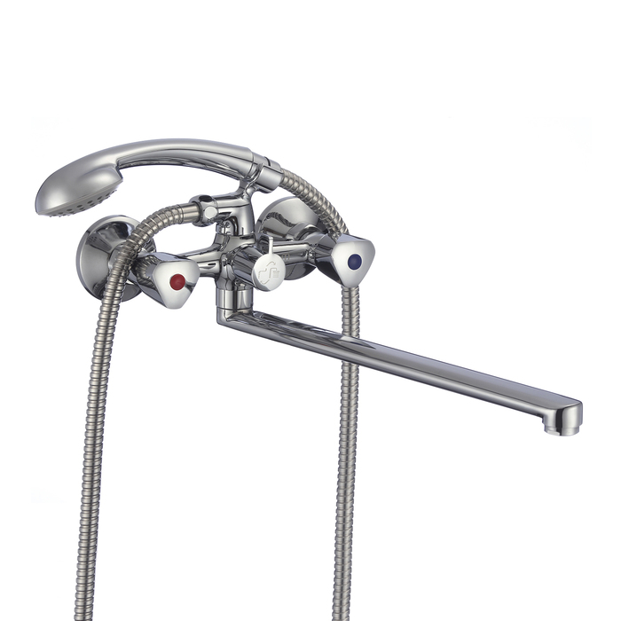 Смеситель для ванны Tring с удобными ручками классической треугольной формы, что позволяет легко регулировать температуру и напор воды даже мыльной рукой. Угол поворота ручек 180о обеспечивает точную регулировку температуры и напора воды, а термоизоляция не позволяет им нагреваться – взрослые и особенно дети защищены от случайных ожогов. Поворотный излив длиной 324 мм делает смеситель удобным как для купания, так и для уборки или стирки. В комплекте лейка для душа, шланг и держатель для лейки.
