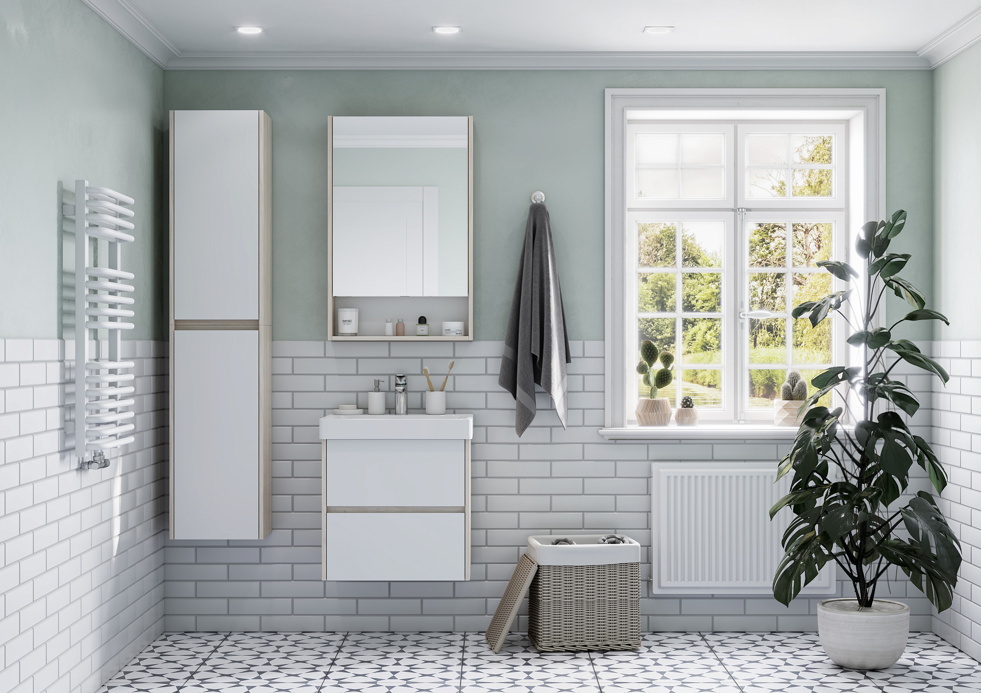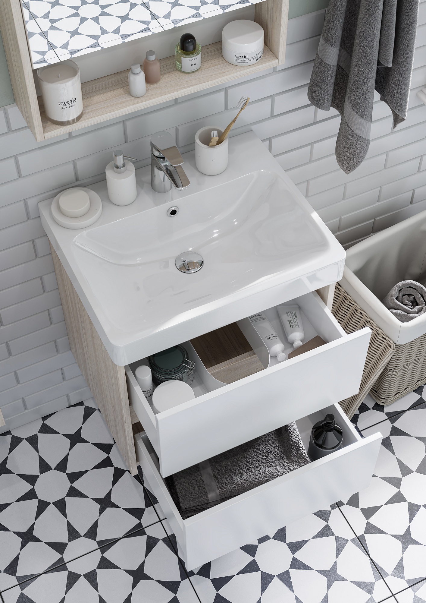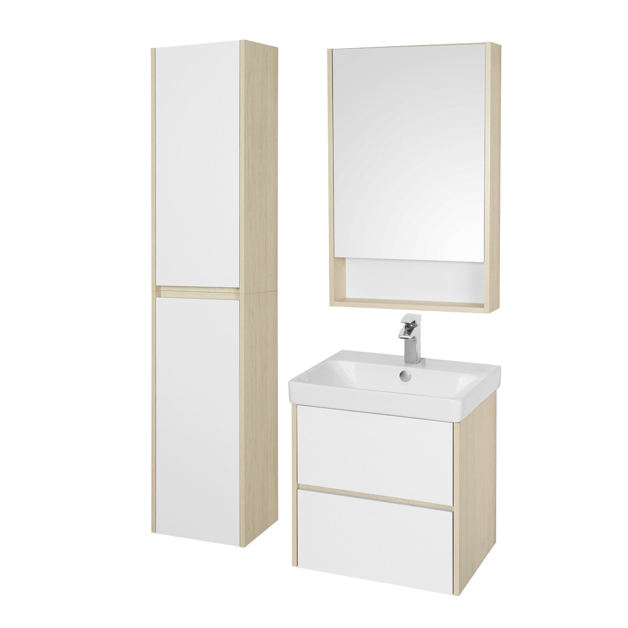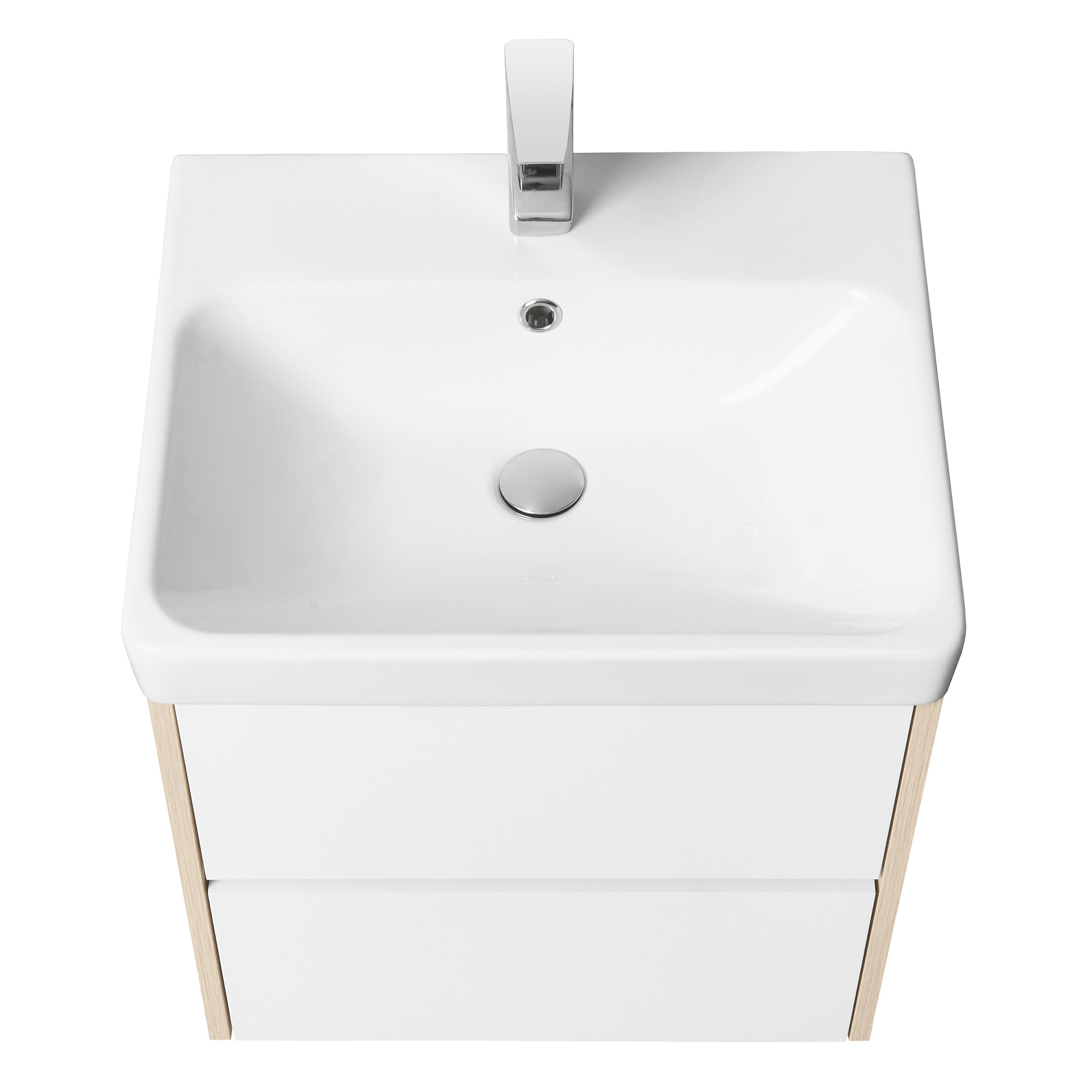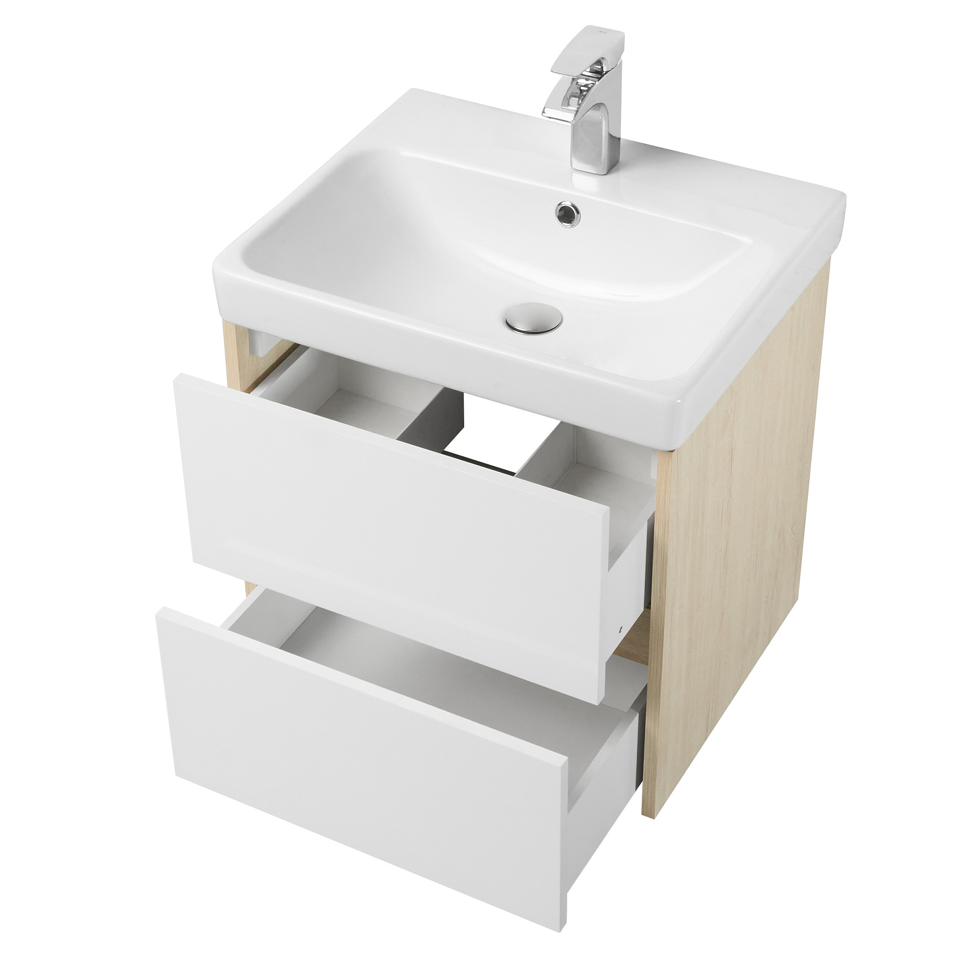 Тумба Сканди 55 выполнена в популярном минималистичном скандинавском стиле. Корпус тумбы выполнен из влагостойкой ЛДСП в декоре натурального дерева, а фасады в белой глянцевой покраске. Конструктивно тумба состоит из 2 вместительных ящиков, установленных на направляющие с интегрированной системой push-to-open для комфортного использования. На тумбе нет выступающих деталей и фурнитуры, открытие ящиков реализовано нажатием на фасад. К тумбе идеально подходит белоснежная раковина Адриана от бренда Santek. Раковина продается отдельно