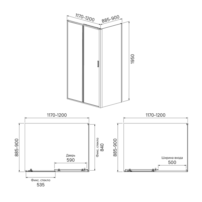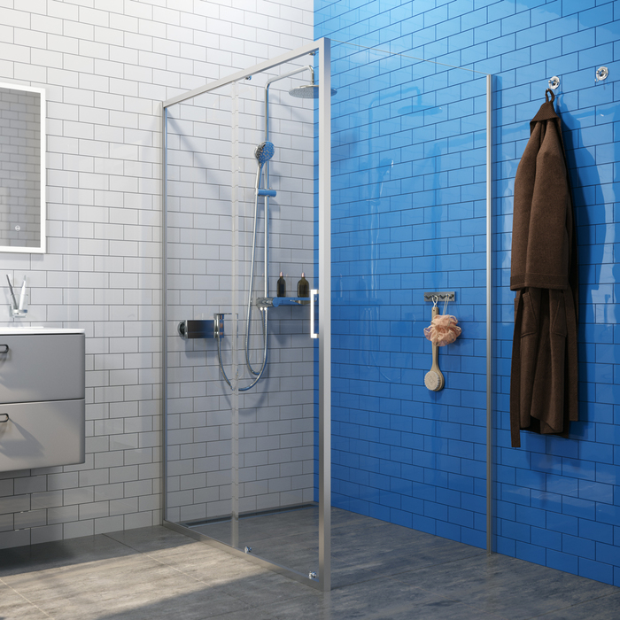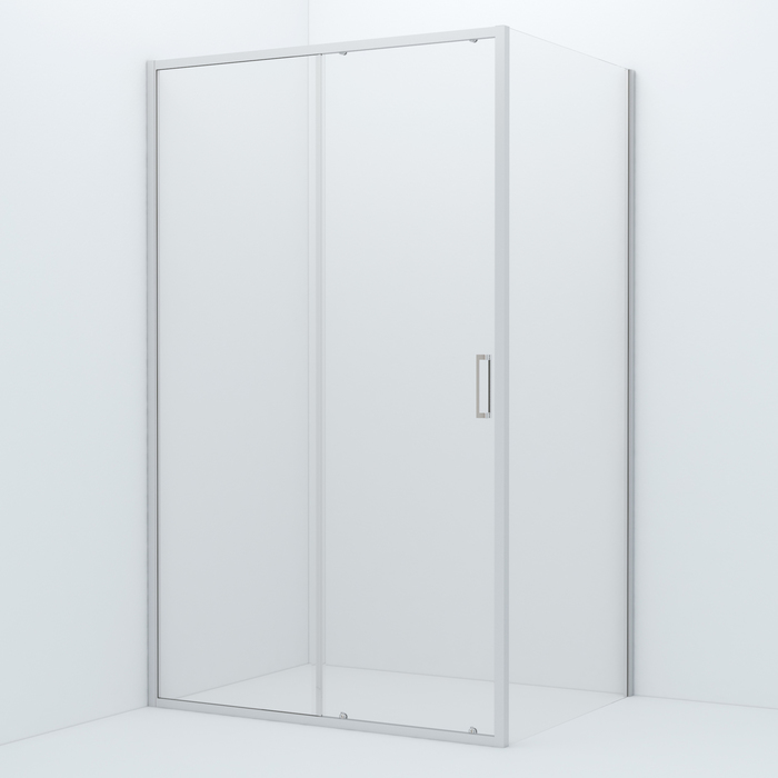 Закаленное прозрачное стекло, алюминиевый профиль, комплект двойных роликов, ручка из сплава металлов, заглушки креплений, силиконовые уплотнители.