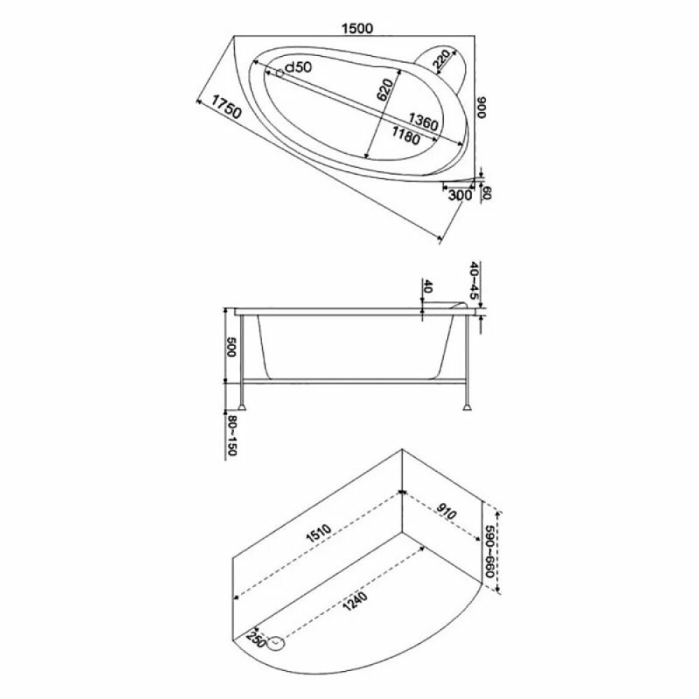 Акриловая угловая ванна 150×90 правая — эргономичное решение для компактных помещений. Правосторонняя асимметричная ванна изготовлена из литьевого акрила толщиной 5 мм. Оптимальные размеры 150×90 см и глубина 44 см обеспечивают комфорт при экономии пространства. Объем 200 л и высота экрана 580 мм создают продуманную конструкцию. В комплекте надежный каркас для устойчивой установки. Произведено в среднем ценовом сегменте. Фронтальная панель и слив-перелив приобретаются отдельно.
