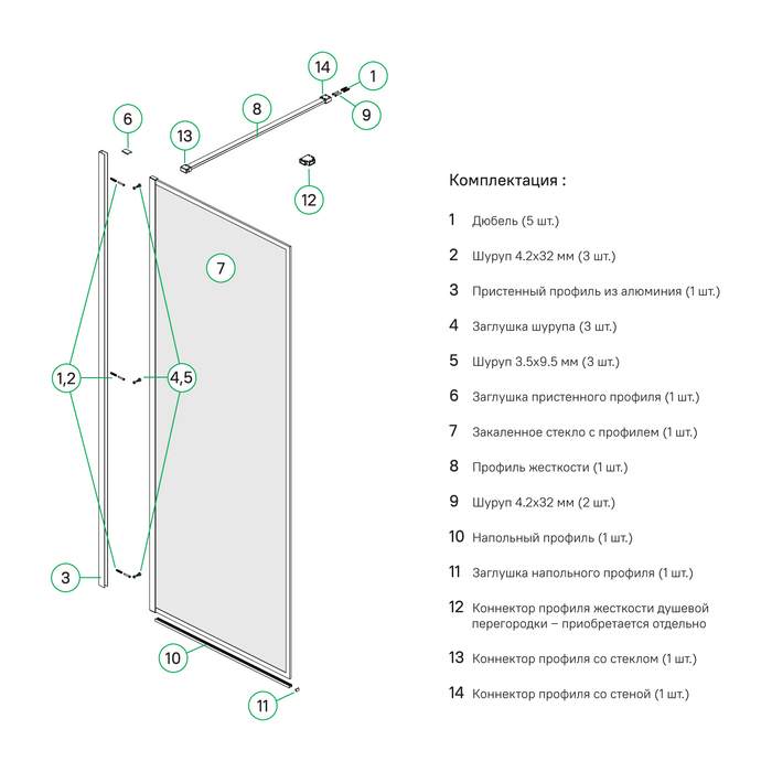Закаленное прозрачное стекло, алюминиевый профиль, заглушки креплений.