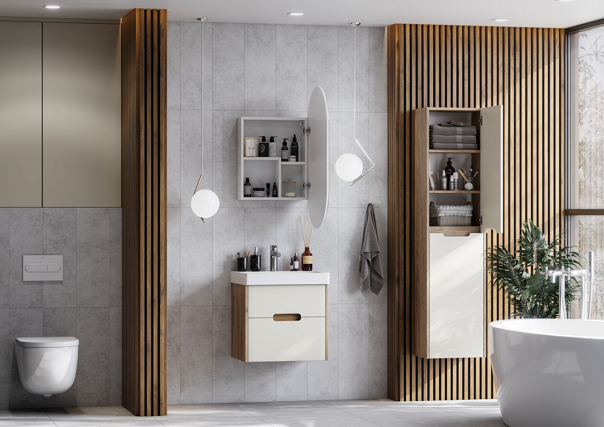 Необычный вырез на фасадах создает имитацию ручки: оригинальный дизайн тумбы без выступающих деталей и комфортное использование. Размер ручки 18 см.