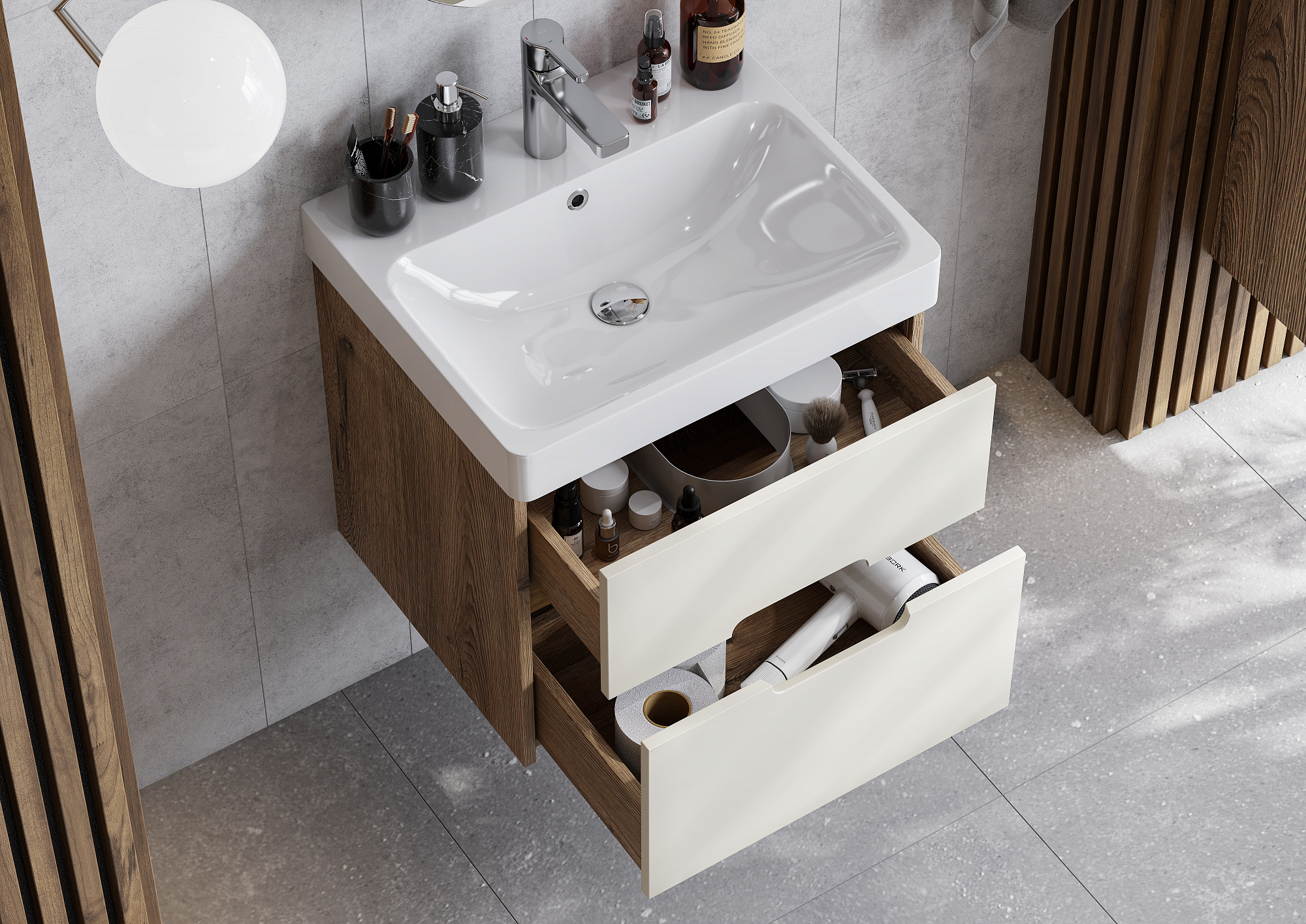 Корпус и внутренние детали ящиков выполнены в единой цветовой гамме.