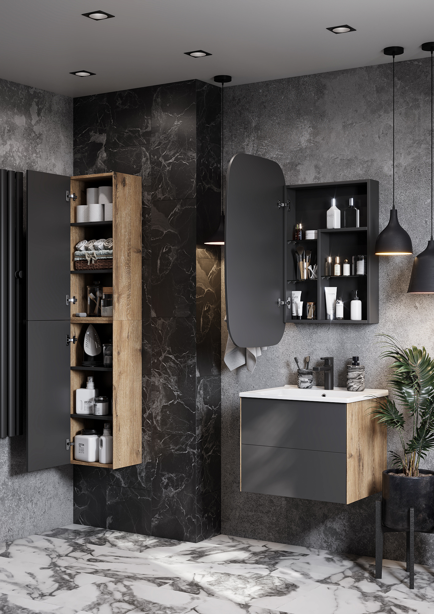 Сохо зеркало необычной овальной формы, скругленные углы добавляют индивидуальности изделию и безопасны в эксплуатации. Корпус и фасад выполнены также в цветовой гамме антрацит. Фасад оснащен петлями с доводчиком. За фасадом с зеркальным полотном расположена ассиметричная конструкция полочек, позволяющая хранить косметические средства различной высоты и объема. Перегородки из ЛВДСП антрацит сочетаются со стеклянными полочками цвета графит