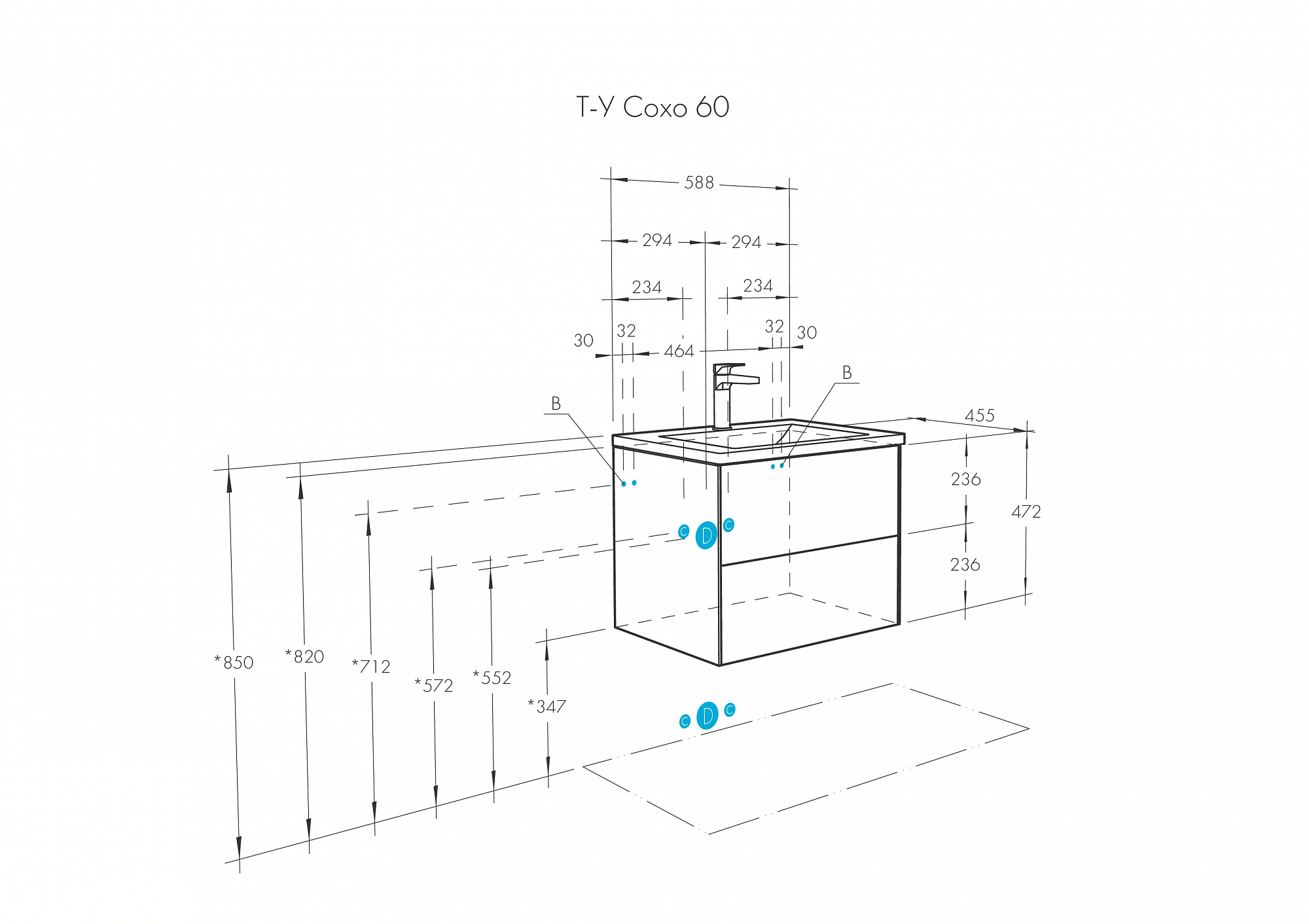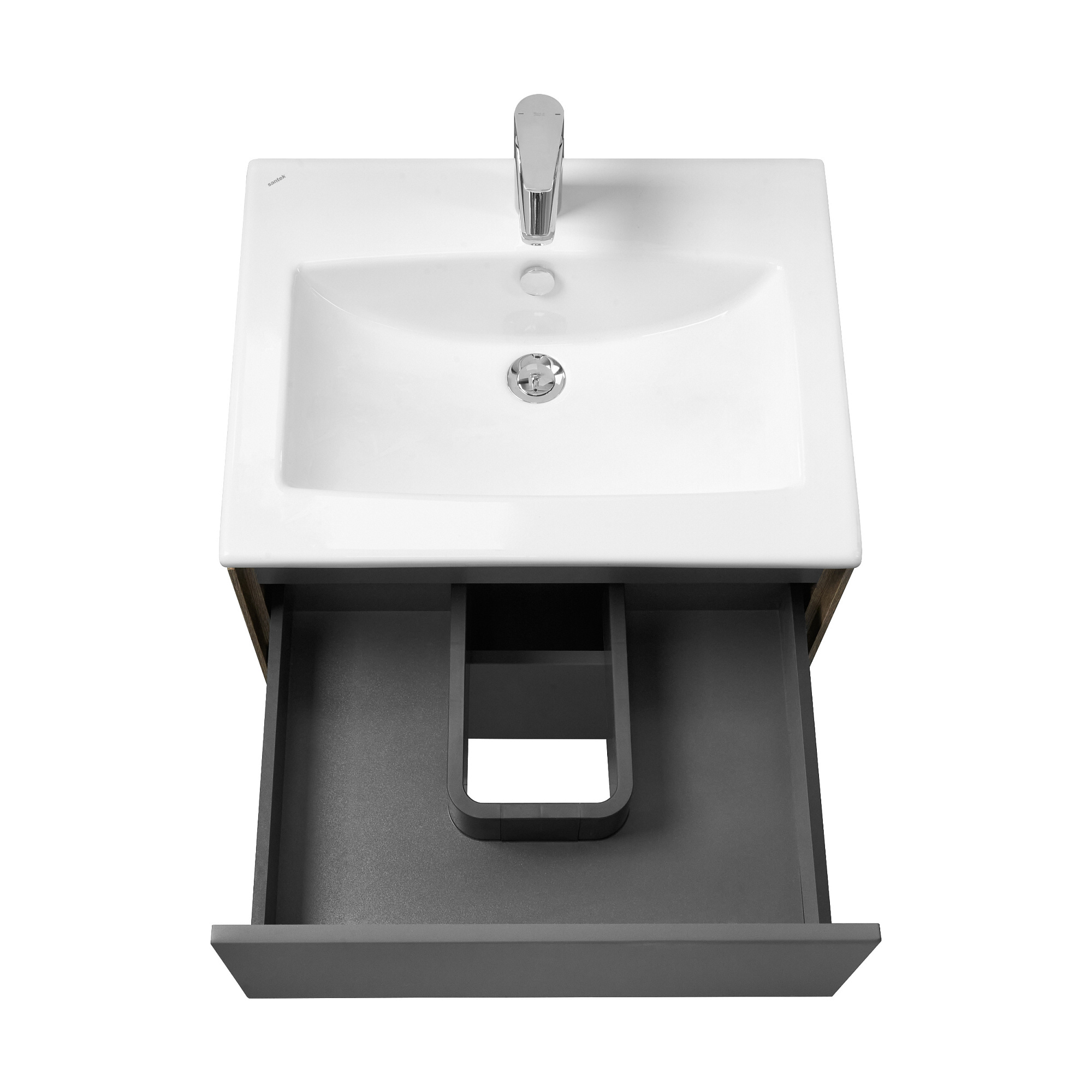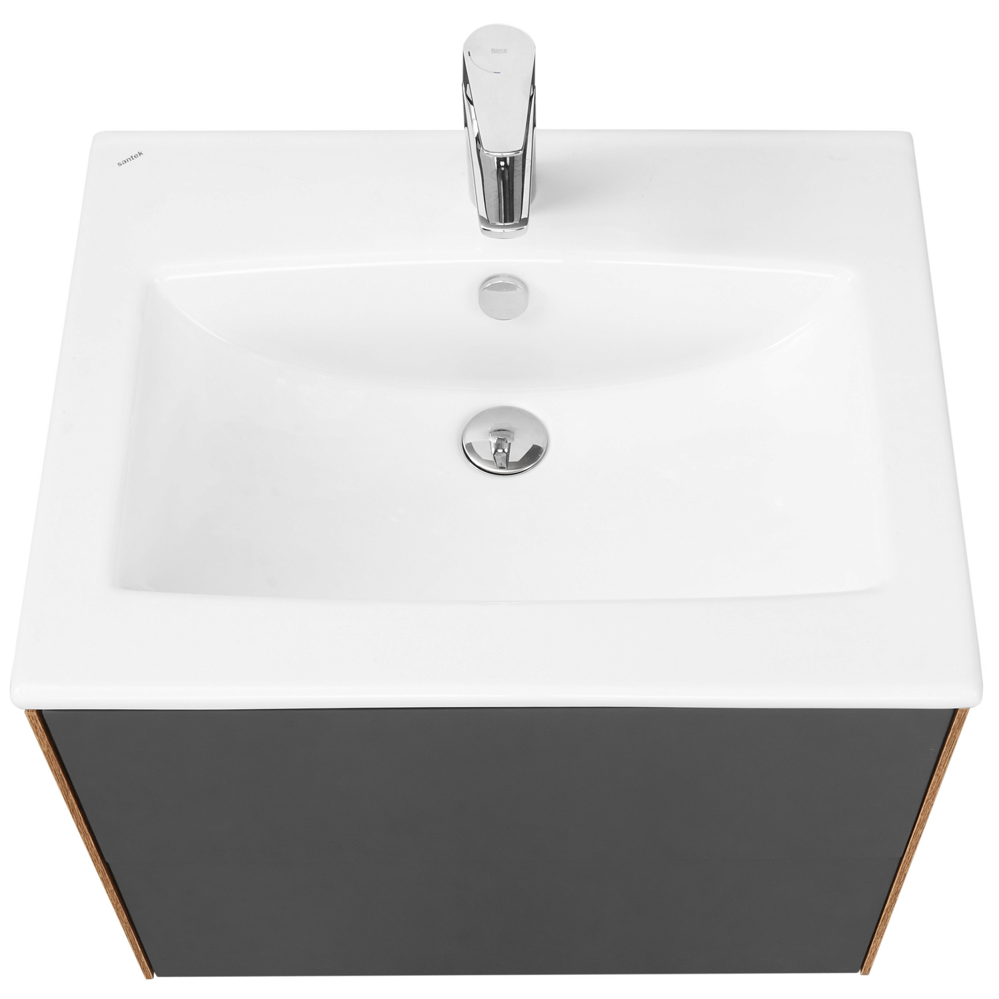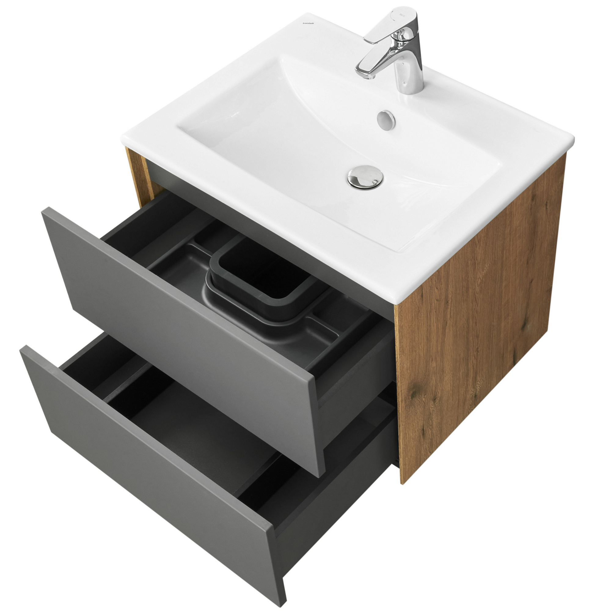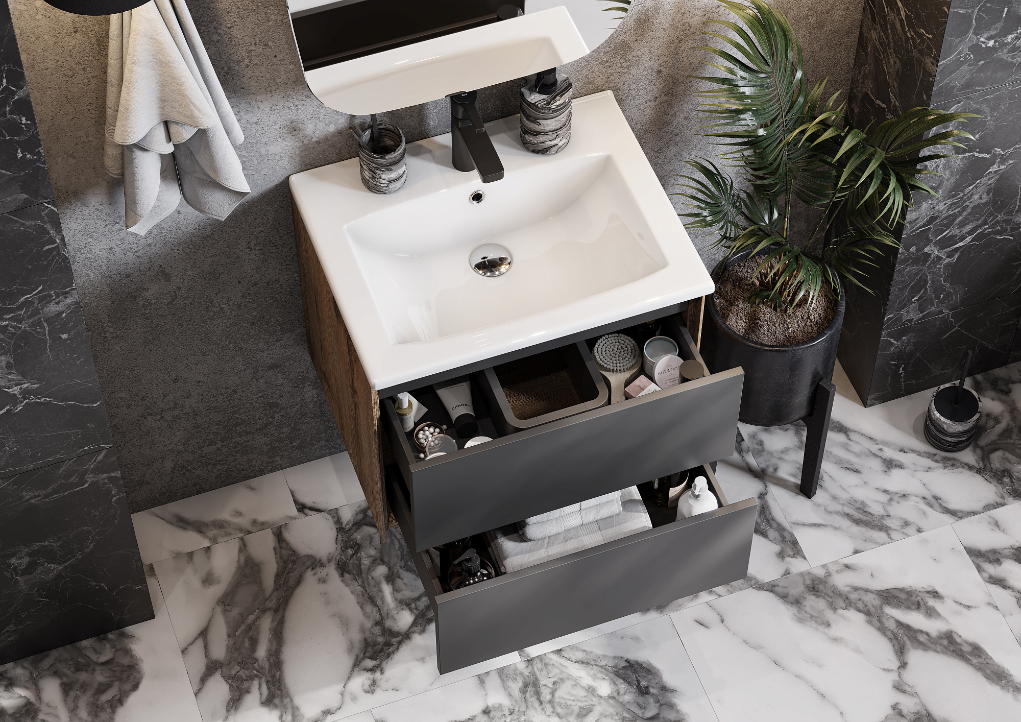 Тумба Сохо 60 функционально состоит из двух вместительных ящиков, оснащенных системой push to open, обеспечивающей надежное, комфортное и бесшумное закрывание. Фасады изделия – МДФ в пленке графит с эффектом soft touch, корпус – ламинированная влагостойкая ДСП Дуб веллингтон. Верхний и нижний ящики оснащены системой организации пространства, которая позволяет содержать косметические средства в идеальном порядке. Дополняет тумбу стильная раковина Элина от бренда Santek с удобной чашей. Все внутренние детали тумбы выполнены в тон фасадов – цвета антрацит