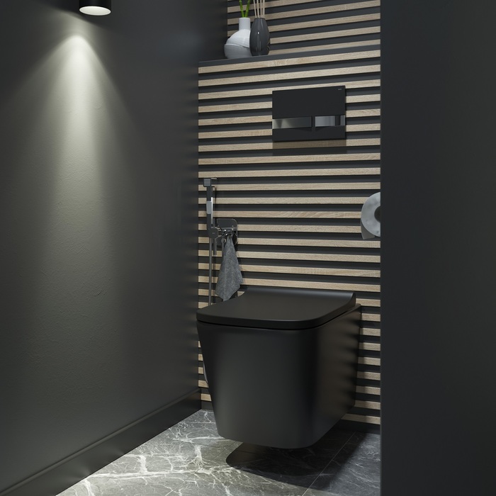 Подвесной унитаз Bild в черном матовом цвете выделяется безупречными прямоугольными гранями и модной эстетикой минимализма. Безободковая конструкция чаши и сиденье с микролифтом делают изделие максимально гигиеничным и удобным. Унитаз Bild идеально впишет