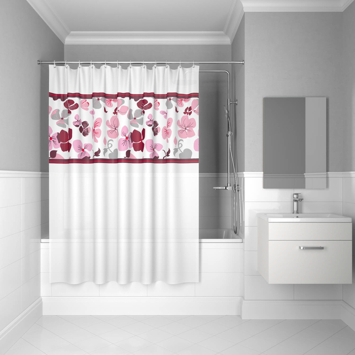 Непрозрачная матовая штора для ванной с ярким цветочным принтом в розовых тонах. Изготовлена из плотного гладкого материала PEVA с приятным на ощупь покрытием soft touch.