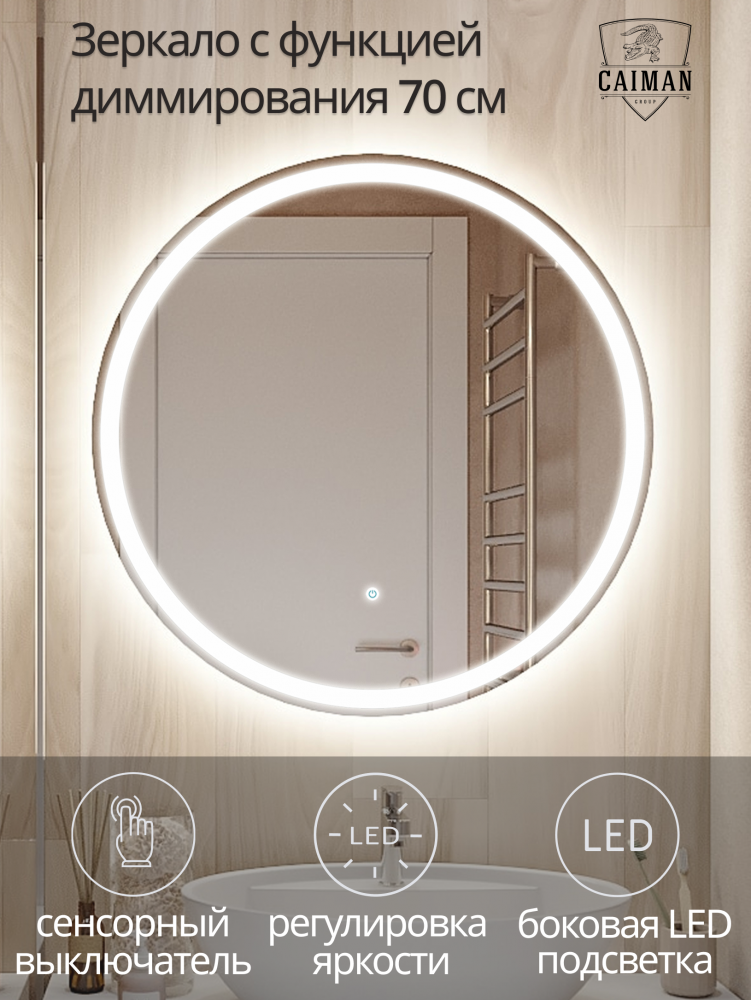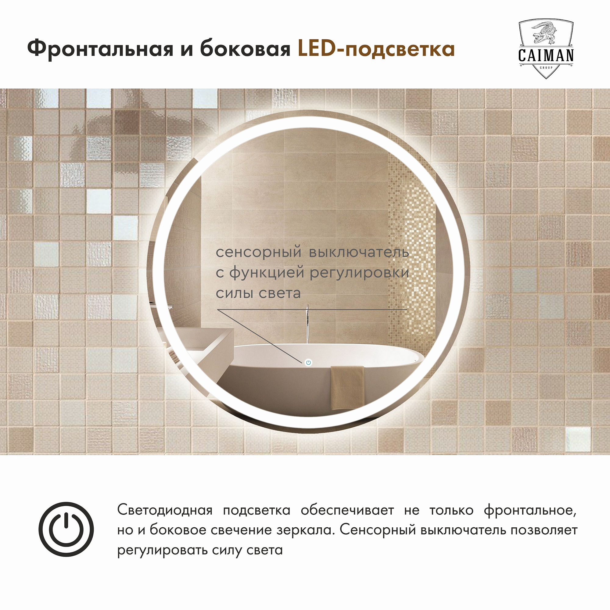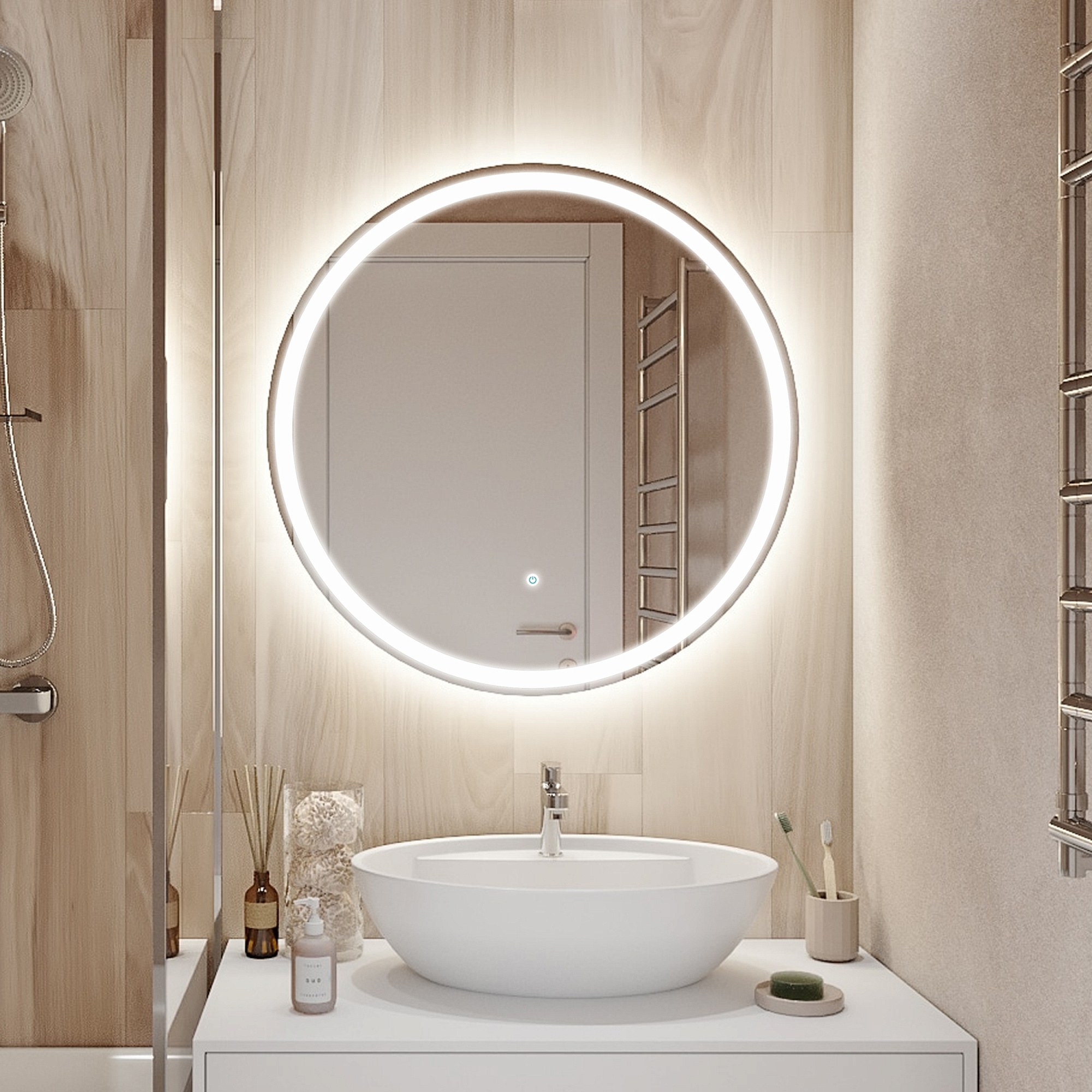 Зеркало оснащено сенсорным выключателем с функцией диммирования, позволяющим настроить яркость освещения.
