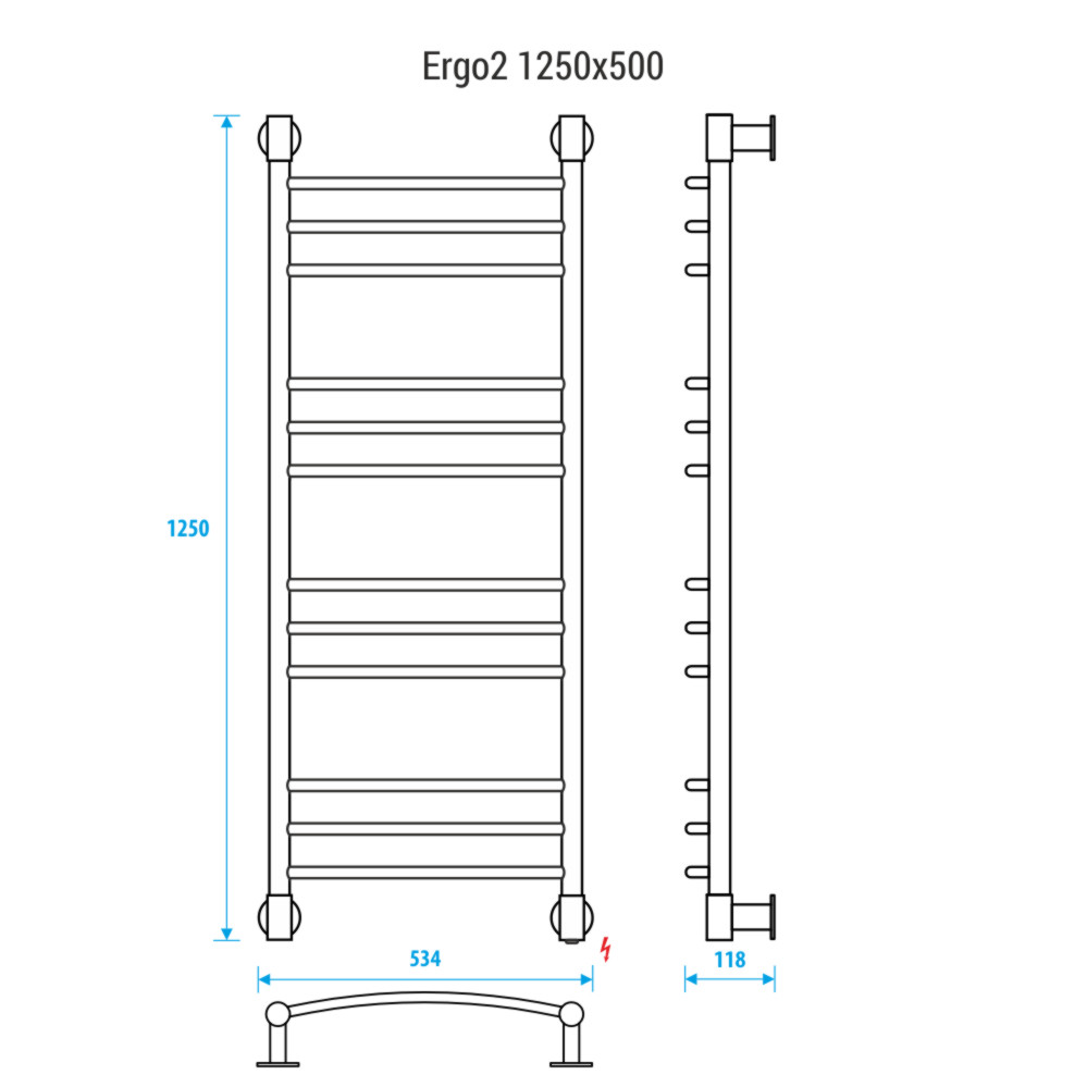 Energy Ergo2 1250x500 – электрический стационарный полотенцесушитель-лесенка с двенадцатью выпуклыми перемычками круглого сечения, выполненный из высококачественной пищевой нержавеющей стали.