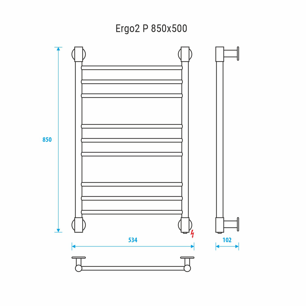 Energy Ergo2 P 850x500 прямой – электрический стационарный полотенцесушитель-лесенка с девятью прямыми перемычками круглого сечения, выполненный из высококачественной пищевой нержавеющей стали.