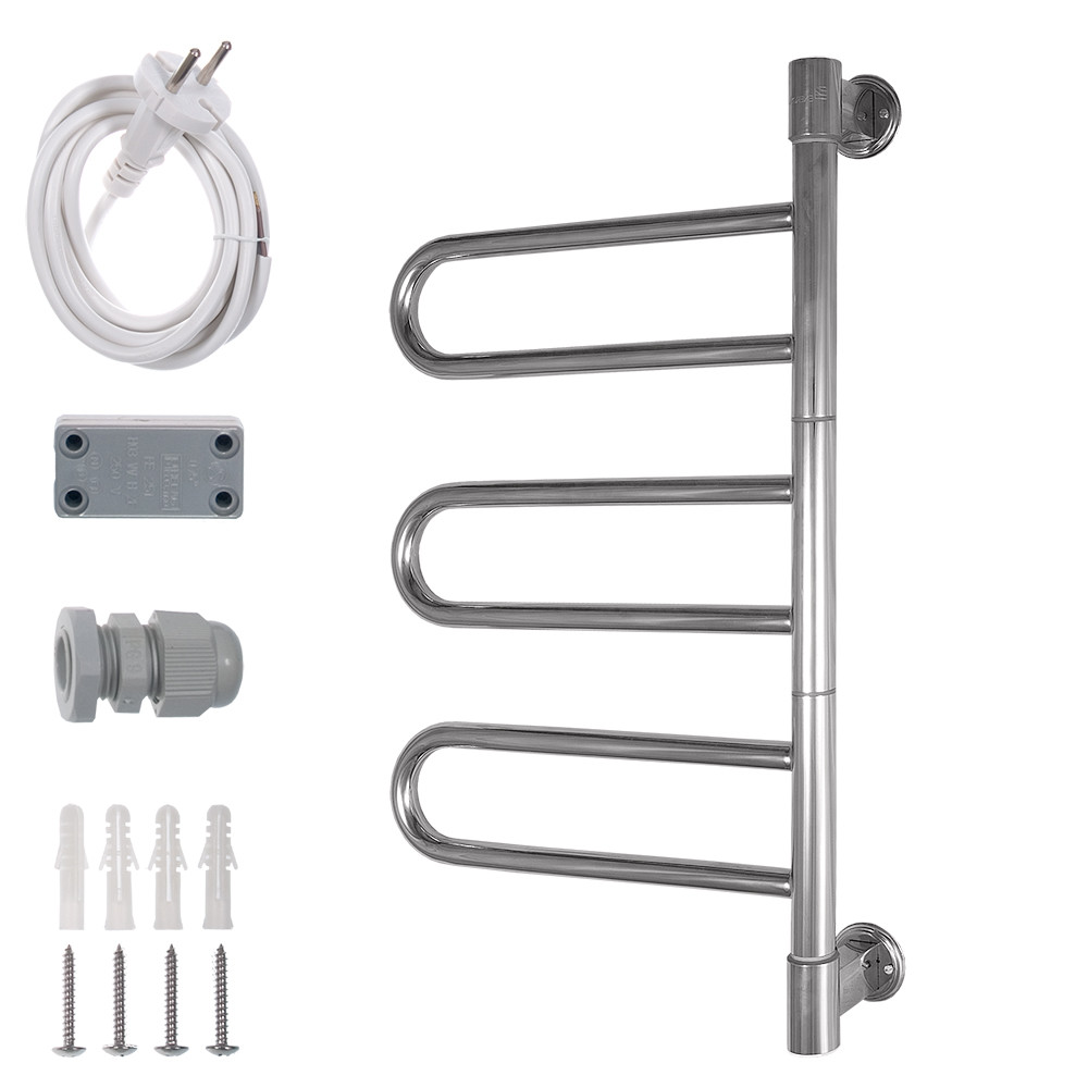 Energy U chrome G3K - электрический полотенцесушитель с тремя U-образными поворотными греющими секциями низкого энергопотребления - 12 Вт на секцию. Предназначен для эффективной просушки изделий из ткани — полотенец, банных халатов и других, а также для дополнительного обогрева ванных комнат, душевых, санузлов и просушки вещей из ткани. Произведён из высококачественной пищевой нержавеющей стали. Нагревательный элемент прибора - греющий кабель в изоляции из кремнийсодержащей резины. Небольшая масса нагревательного элемента делает прибор легче, что упрощает процедуру его монтажа. Монтаж предусматривает возможность скрытого или наружного подключения кабеля. Подключение производится через нижнюю стойку, на которой находится клавиша включения. Energy U chrome G3K мощностью 37 Вт экономичен в эксплуатации и сопоставим по энергозатратам с электрической лампочкой. Полотенцесушитель электрический Energy U chrome G3K не нуждается в заземлении, так как имеет II класс электрической защиты и степень защиты от влаги IP 44. Оснащён влагозащищенным выключателем с индикатором работы. Нагревается до рабочей температуры за 5-10 минут. Прибор соответствует всем европейским стандартам электробезопасности и подходит для эксплуатации в помещениях с повышенной влажностью. Для придания безукоризненного блеска поверхность Energy серии U подвергается электроплазменной полировке. Получаемая в результате зеркальная поверхность не тускнеет и устойчива к механическим повреждениям в течение всего срока эксплуатации