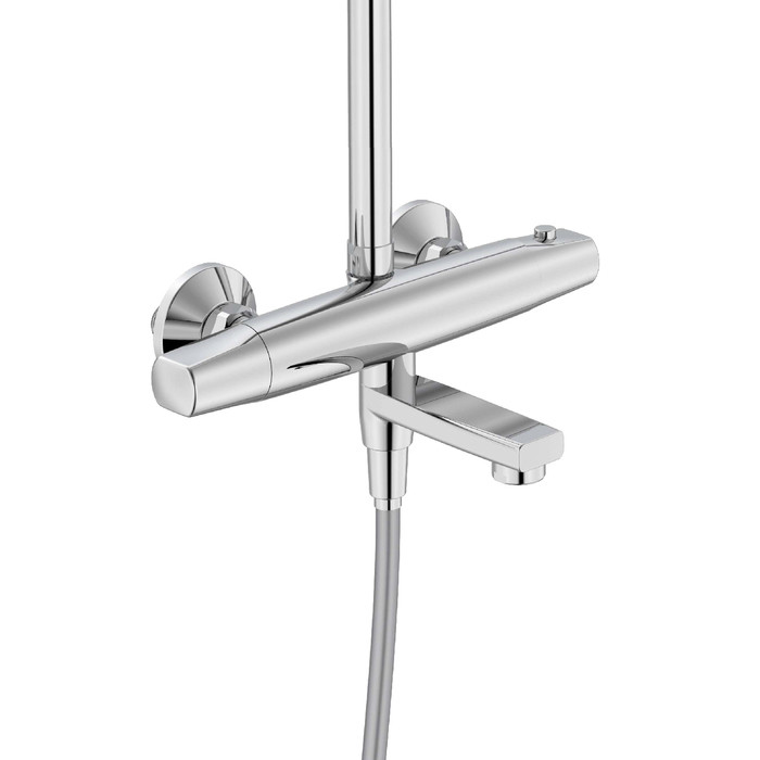 Смеситель для ванны Torr с термостатом и верхним душем – универсальный дизайн при современном функционале, оптимальный для городской квартиры и загородного дома. Термостат позволяет сэкономить время на настройке нужной температуры воды при каждом включении, при этом полностью защищает от ожогов, связанных с перепадами давления и температуры воды в сети. Две лейки большого диаметра – верхняя O229 мм и ручная O110 мм – создают объемный и приятный для тела поток воды. Смеситель привнесет максимум комфорта в привычные душевые процедуры. В комплекте гибкий душевой шланг с защитой от перекручивания и крепеж. • Регулируемая высота стойки (1,2-1,4 м) позволяет с комфортом принимать душ даже самым высоким. • Керамический дивертор переключается поворотом излива и надежно переключает поток воды на верхнюю и ручную лейки или обеспечивает их одновременную работу в комбинированном режиме. Гарантия на смесители IDDIS® – 10 лет, на душевые аксессуары – 3 года. (с) Авторский текст, январь 2023 г