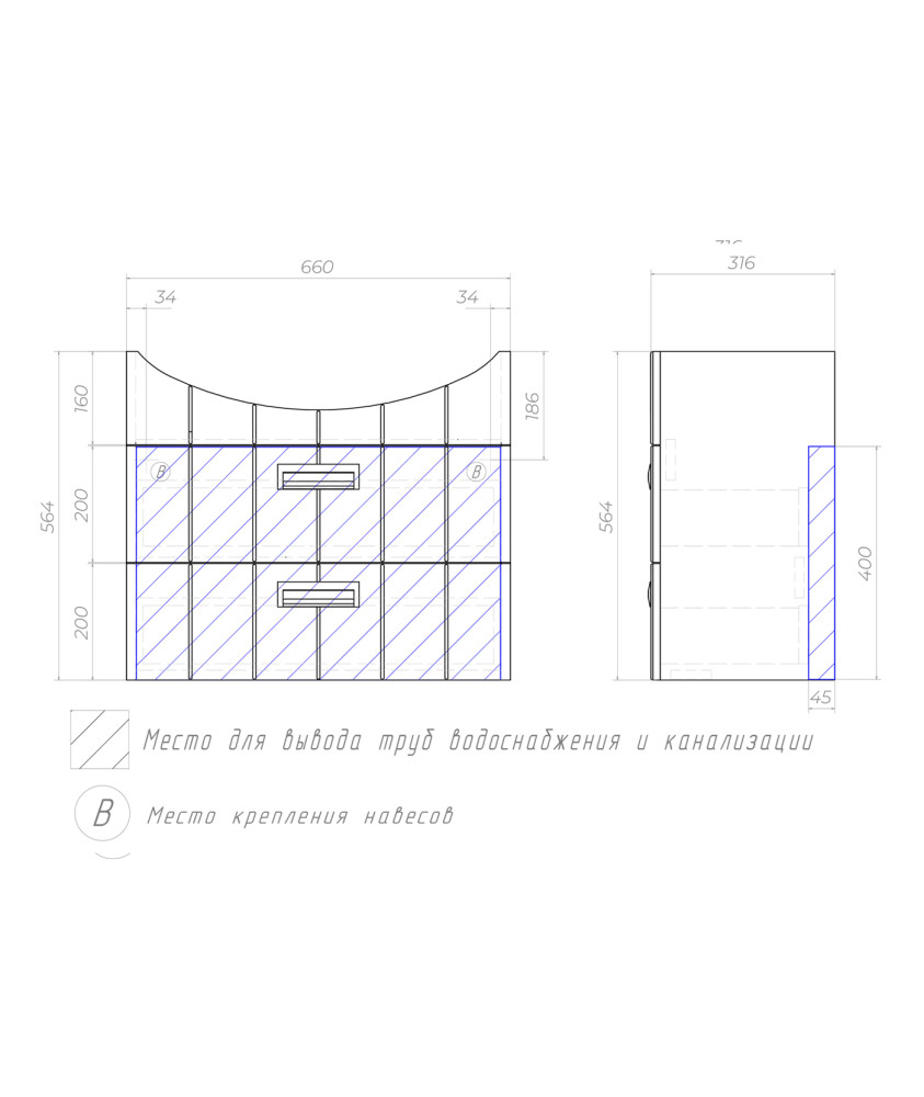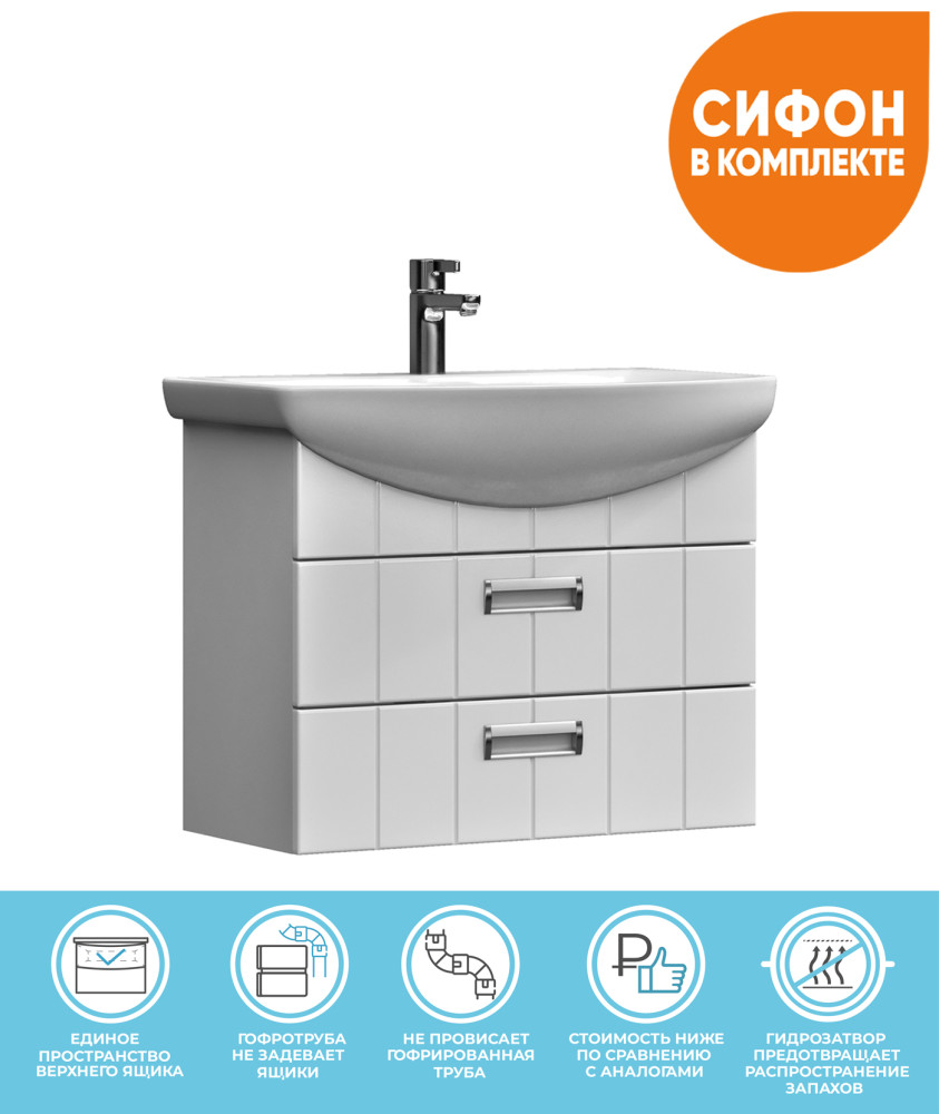 2 выдвижных ящика, шариковые направляющие полного выдвижения, 2 навеса, 1 сифон