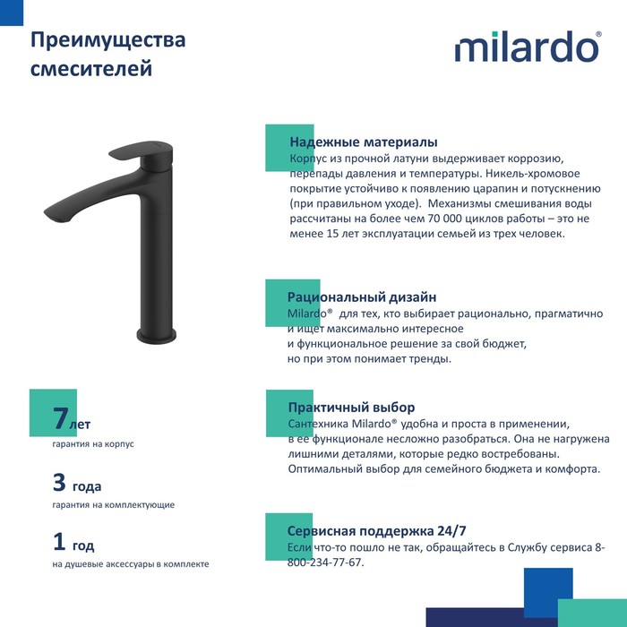 Смеситель для умывальника Rora отличается универсальным характером: основной акцент в его дизайне приходится на плавные линии корпуса и трендовый цвет. Модель в черном цвете одинаково выигрышно смотрится на контрастных белоснежных раковинах и дополняет собой однотонную керамику. Конструкция высокого смесителя обеспечивает дополнительный комфорт в ежедневном использовании и подходит для установки с накладными раковинами-чашами. В комплекте гибкая подводка и крепеж. • Качественный механизм смешивания воды смесителя Milardo® рассчитан на более чем 70 000 циклов работы – это не менее 15 лет эксплуатации семьей из трех человек. • Электрофоретическое матовое покрытие делает поверхность смесителя устойчивой к условиям высокой влажности – такой смеситель прослужит дольше и сохранит свой первоначальный внешний вид. • Встроенный аэратор легко извлекается из корпуса смесителя с помощью обычной монетки, что значительно упрощает его очистку. • Гарантия на смеситель Milardo® – 7 лет, на картридж – 3 года