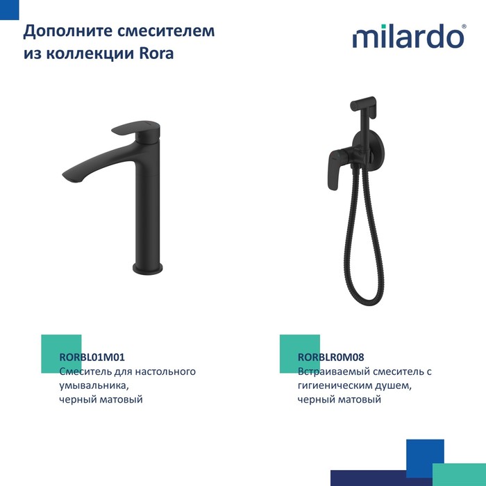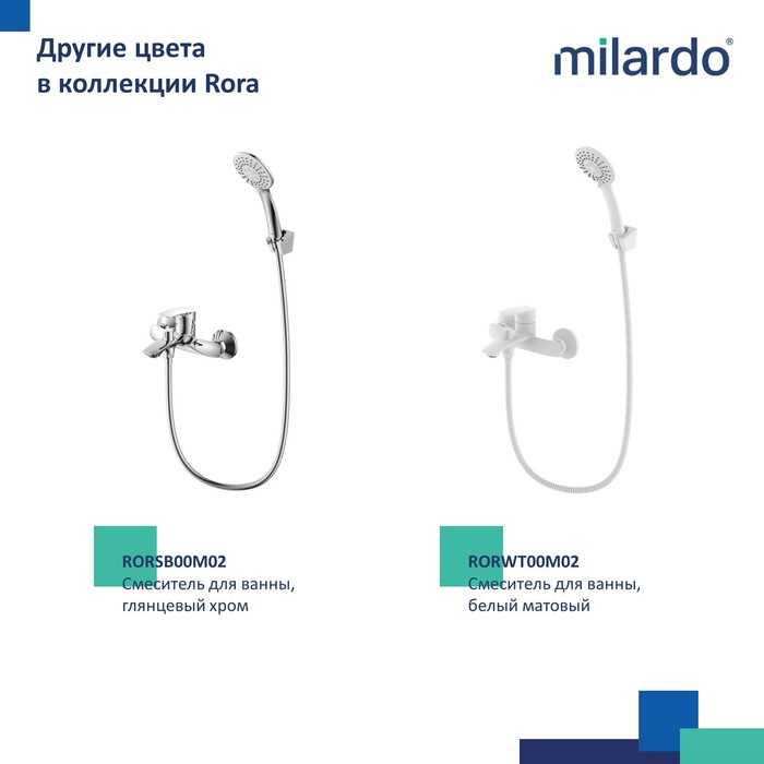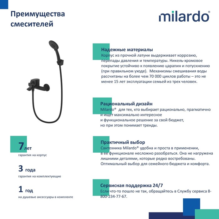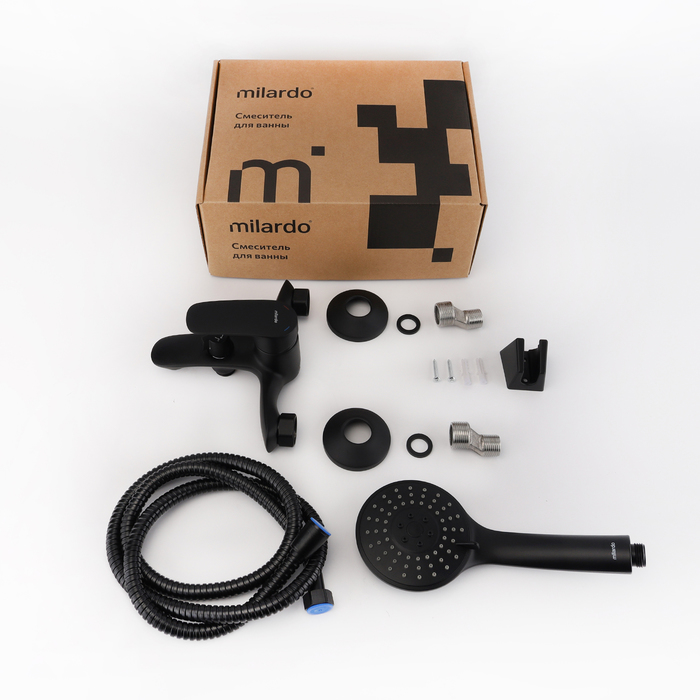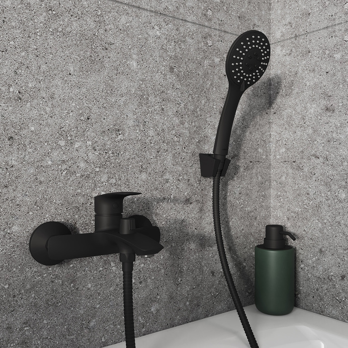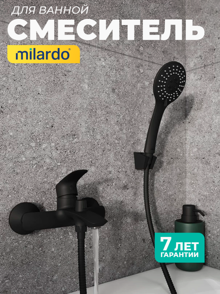 Смеситель для ванны Rora отличается универсальным характером: основной акцент в его дизайне приходится на плавные линии корпуса и трендовый черный цвет. Модель с коротким фиксированным изливом надежна и удобна в ежедневном использовании. Интенсивность и температура потока легко регулируются удобной ручкой смесителя. Поворотный дивертор работает при любом давлении воды, переключая поток воды на большую душевую лейку (ø 100 мм) или в комбинированном режиме. • Ручная лейка из прочного ABS-пластика, ПВХ-шланг (1,5 м) в оплетке из нержавеющей стали и крепеж идут в комплекте. • Качественный механизм смешивания воды смесителя Milardo® рассчитан на более чем 70 000 циклов работы – это не менее 15 лет эксплуатации семьей из трех человек. • Электрофоретическое матовое покрытие делает поверхность смесителя устойчивой к условиям высокой влажности – такой смеситель прослужит дольше и сохранит свой первоначальный внешний вид. • Гарантия на смеситель Milardo® – 7 лет, на картридж – 3 года, на душевые аксессуары – 1 год