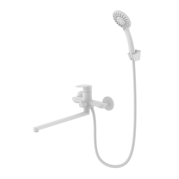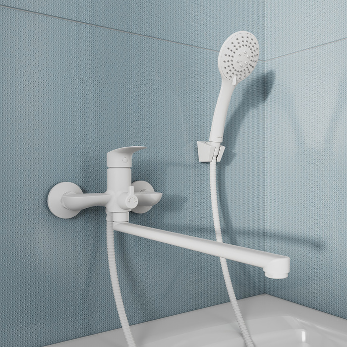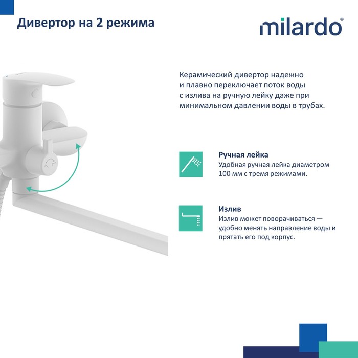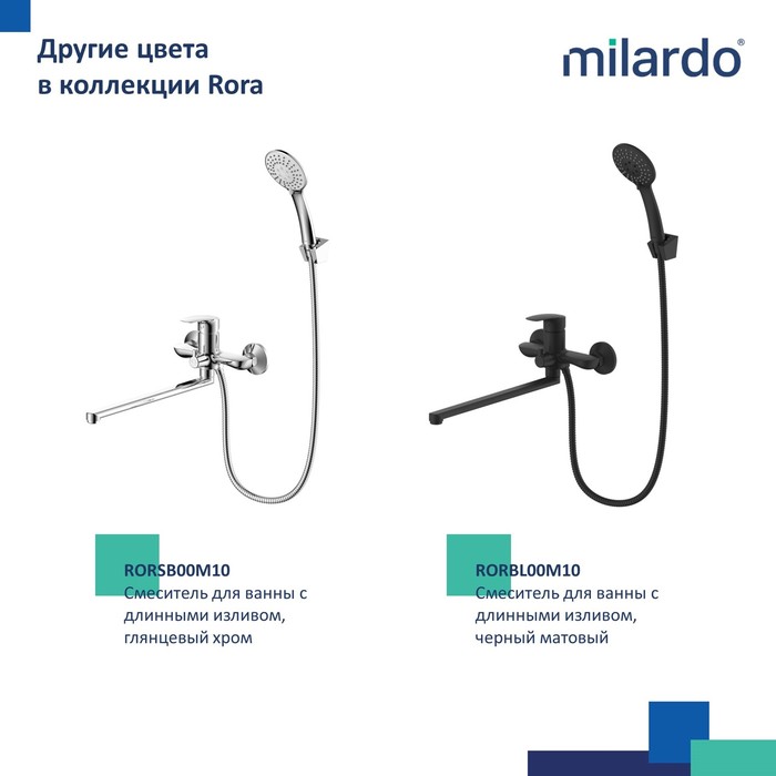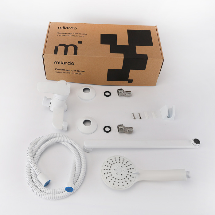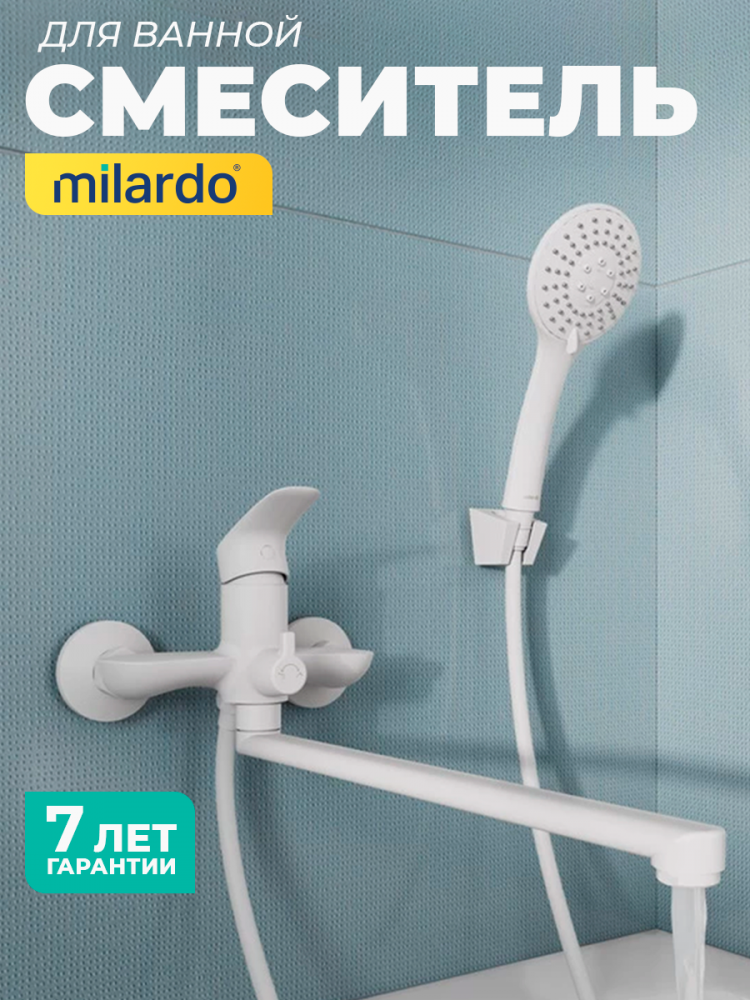 Смеситель для ванны Rora отличается универсальным характером: основной акцент в его дизайне приходится на плавные линии корпуса и трендовый белый цвет. Наличие длинного (35 см) излива позволяет использовать пространство ванны максимально эффективно. Интенсивность и температура потока легко регулируются удобной ручкой смесителя. Поворотный дивертор работает при любом давлении воды, переключая поток воды на большую душевую лейку (ø 100 мм) или в комбинированном режиме. • Ручная лейка из прочного ABS-пластика, ПВХ-шланг (1,5 м) в оплетке из нержавеющей стали и крепеж идут в комплекте. • Качественный механизм смешивания воды смесителя Milardo® рассчитан на более чем 70 000 циклов работы – это не менее 15 лет эксплуатации семьей из трех человек. • Электрофоретическое матовое покрытие делает поверхность смесителя устойчивой к условиям высокой влажности – такой смеситель прослужит дольше и сохранит свой первоначальный внешний вид. • Гарантия на смеситель Milardo® – 7 лет, на картридж – 3 года, на душевые аксессуары – 1 год