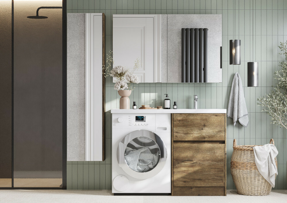 Тумба Лондри под стиральную машину выполнена из влагостойкой ламинированной плиты в древесной отделке.