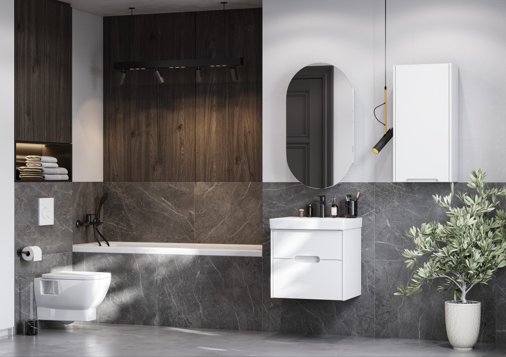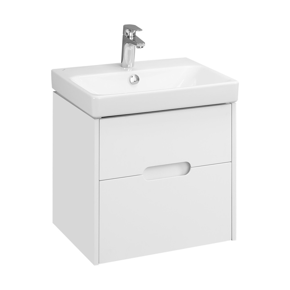 Корпус тумбы Оливия изготовлен из влагостойкой ламинированной ДСП в белой матовой покраске, а фасады ящиков в пленке от европейского производителя надежно защитят мебель от воздействия влаги в условиях ванной комнаты. Ящики установлены на направляющие полного выдвижения с доводчиками, что обеспечит легкий доступ ко всем предметам, которые хранятся в ящиках. Корпус и внутренние детали ящиков выполнены в единой цветовой гамме. Необычный вырез на фасадах создает имитацию ручки: оригинальный дизайн тумбы без выступающих деталей и комфортное использование. Размер ручки 18 см. Тумба комплектуется удобной современной керамической раковиной Адриана от бренда Santek