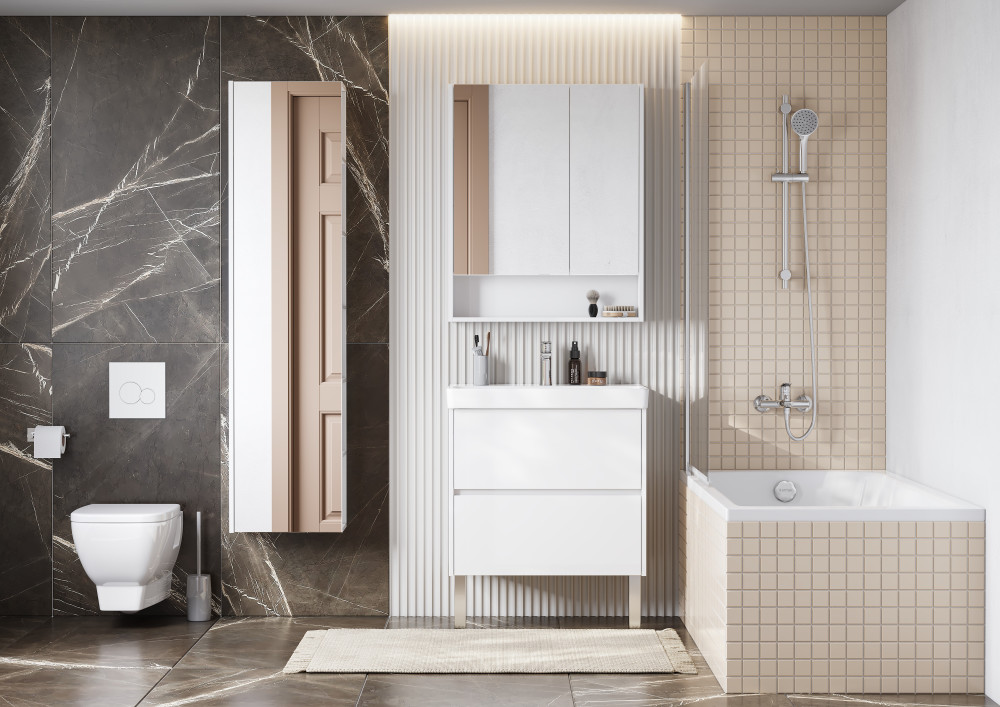 Тумба Сканди 70 выполнена в популярном минималистичном скандинавском стиле. Корпус тумбы выполнен из влагостойкой ЛДСП в белой матовой покраске, а фасады в белой глянцевой покраске. Конструктивно тумба состоит из 2 вместительных ящиков, установленных на направляющие с интегрированной системой push-to-open для комфортного использования. На тумбе нет выступающих деталей и фурнитуры, открытие ящиков реализовано нажатием на фасад. Тумба комплектуется белоснежной раковиной Адриана от бренда Santek. Тумбу по желанию можно использовать в двух вариантах: как подвесную или дополнительно приобрести опоры