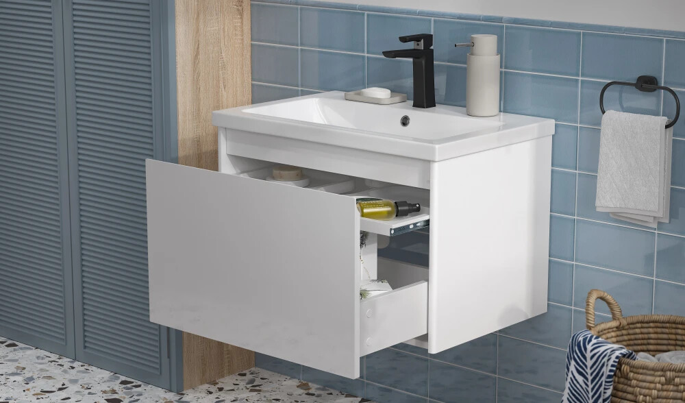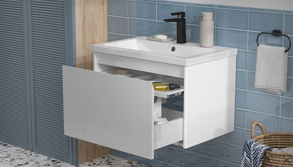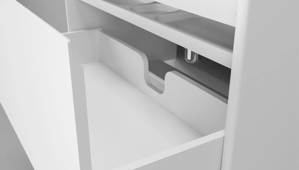 Продуманная система хранения. Высокие ящики с направляющими полного выдвижения позволяют использовать весь объем ящика для хранения высоких флаконов и бытовых принадлежностей.