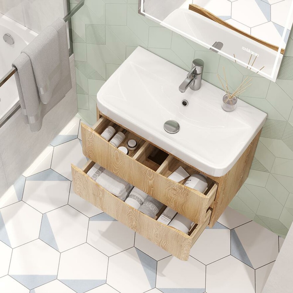 Тумба подвесная Clay 70 2Y дуб верона (под раковину 217496) Velvex. Тип крепления: Подвесной. Цвет: Дуб Верона. Размер: Ш684хГ343хВ491мм. Материалы тумбы: МДФ, влагостойкая ЛДСП, полимерное покрытие ПВХ,интегрированная ручка, европейская фурнитура. Система хранения: два выдвижных ящика с системой плавного закрывания. Размер тумбы с раковиной: Ш700±5хГ350хВ548 мм (раковина 9595(70)). Цвет: фасад и боковины: дуб верона; ящики: дуб золотой