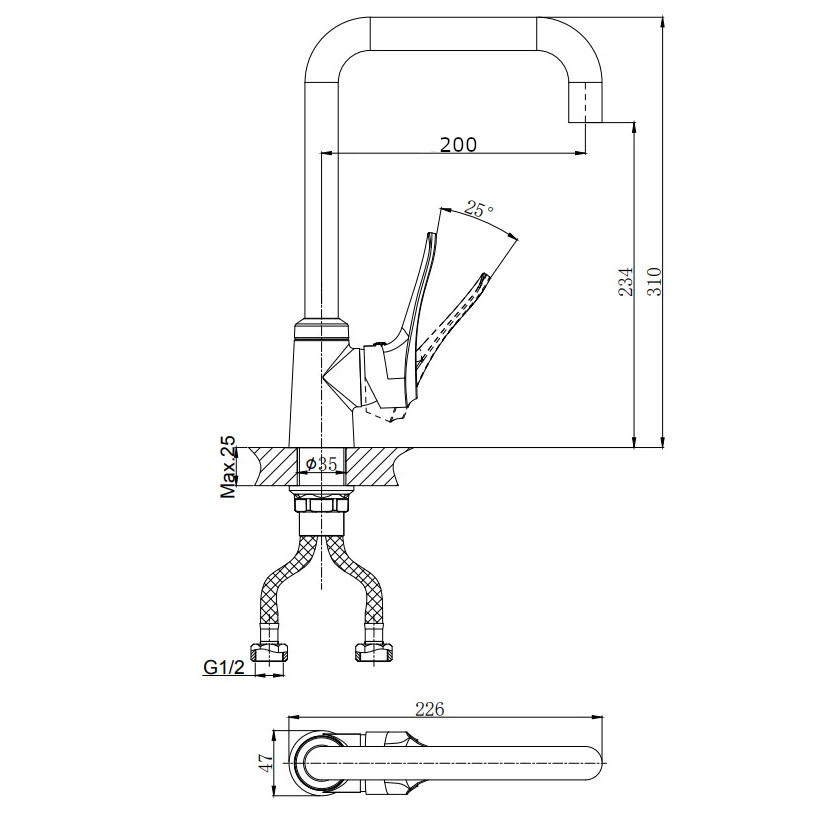 Смеситель для кухни RUSH арт. JA0735-23 с поворотным изливом из коллекции Jawa с металлической ручкой, изготовлен из высококачественной латуни и имеет рычажное управление. В смеситель установлен картридж D-35 с керамическими пластинами. Высота смесителя 310 мм. Излив поворотный 200 мм. Высота излива до аэратора 234 мм. Аэратор изготовлен из пластика с нержавеющим корпусом