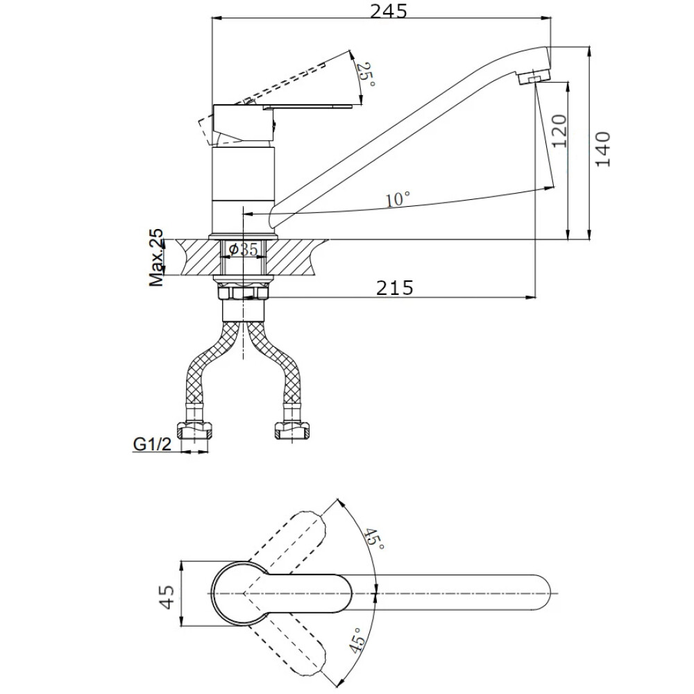 Смеситель для кухни RUSH арт. TE2835-26 с поворотным изливом с металлической ручкой из коллекции Tenerife изготовлен из высококачественной латуни и имеет рычажное управление. В смеситель установлен картридж D-35 с керамическими пластинами. Высота смесителя 140 мм. Излив поворотный 215 мм. Высота излива до аэратора 120 мм. Аэратор изготовлен из пластика с нержавеющим корпусом, угол наклона - 10 гр. В комплекте универсальная присоединительная группа для установки на горизонтальную поверхность, гибкая подводка с латунными гайками 40 см - 2шт, фум-лента, индивидуальный пакет, паспорт, гарантийный талон