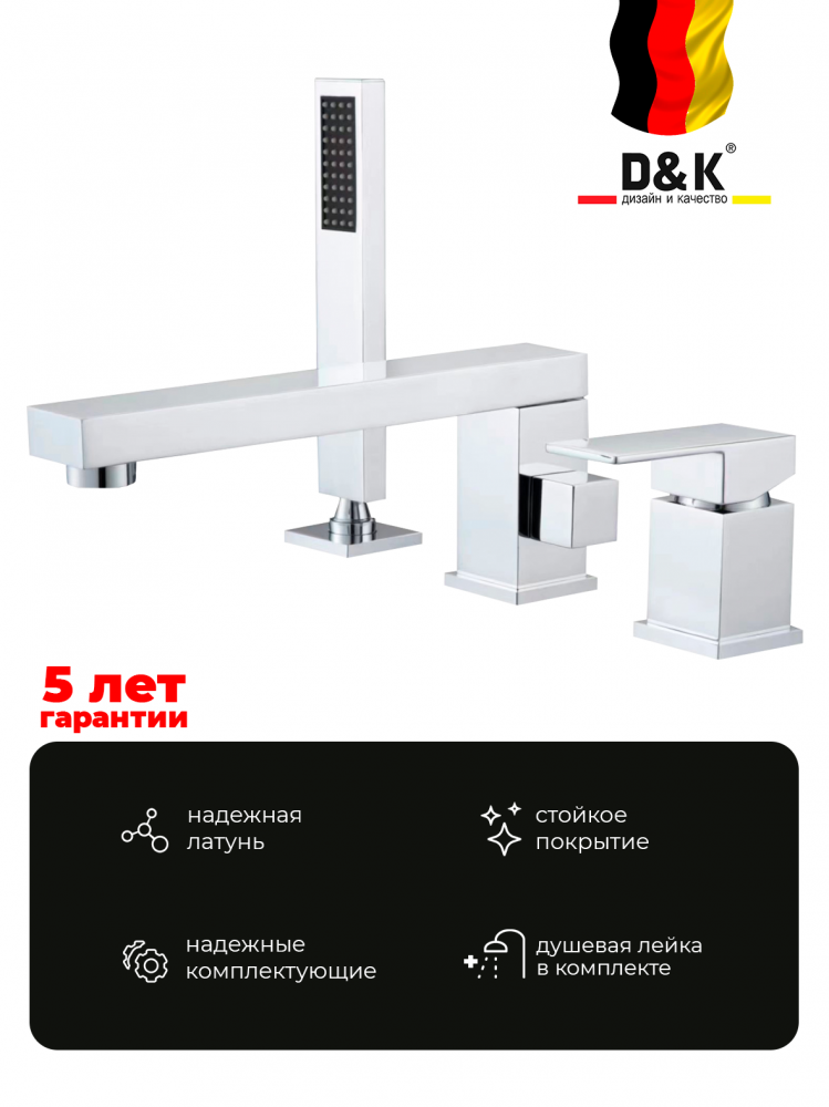 Смеситель на борт ванны D&K Bayern.Liszt DA1514901 Liszt - современный и актуальный дизайн, вобравший в себя ключевые тренды и отвечающий реальным запросам сегодняшнего дня с выбором популярных цветовых решений глянцевый хром и loft-black поможет создать идеальную кухню и ванную комнату каждому. - Бесплатное гарантийное обслуживание - 10 лет; - Смесители из латуни высокого качества, безопасны для людей и домашних животных из-за пониженного содержания свинца; - Блестящее хромированное покрытие обладает высокими защитными и декоративными свойствами; - Протестирован на 500 000 циклов включения, что составляет более 30 лет повседневного использования, семьи из четырёх человек; - Аэратор Neoperl экономит воду за счет смешивания с воздухом, струя становится ровнее и мягче, снижая уровень шума; - Душевая лейка и шланг длиной 200 см уже в комплекте