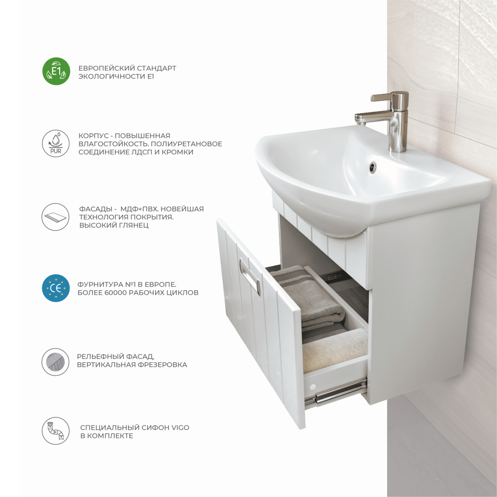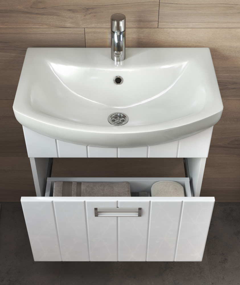 Тумба подвесная, 1 вестительный выдвижной ящик; ручка врезная металлическая хромированная. Материал корпуса: влагостойкая ЛДСП Материал фасадов: ЛМДФ Покрытие: пленка ПВХ Ящики: направляющие полного выдвижения